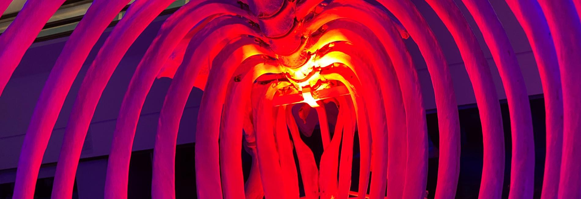 Photo of inside the ribcage of a hippo, lit up with red light