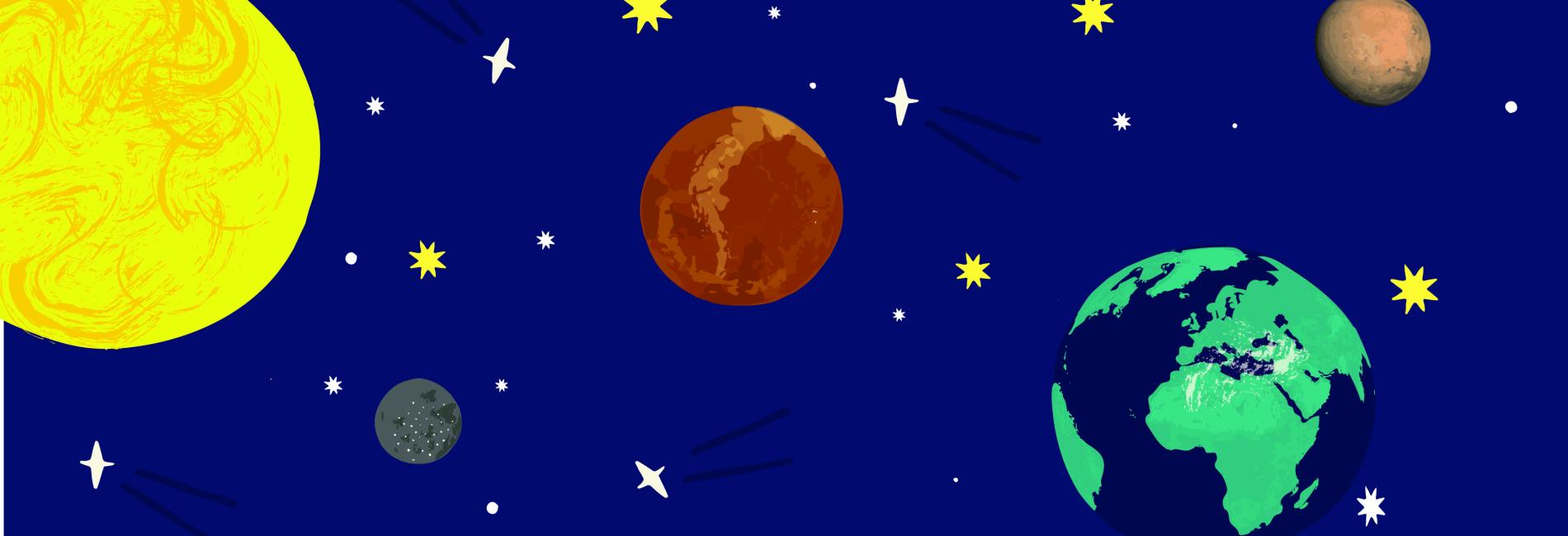 Drawing of a dark blue sky with stars, sun and planets