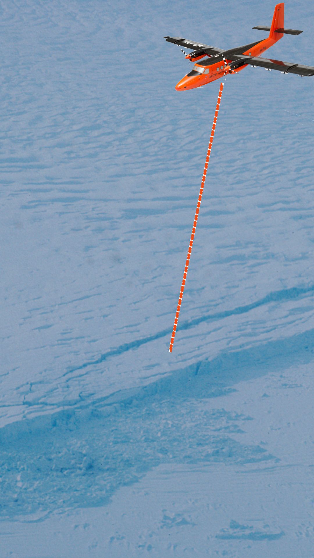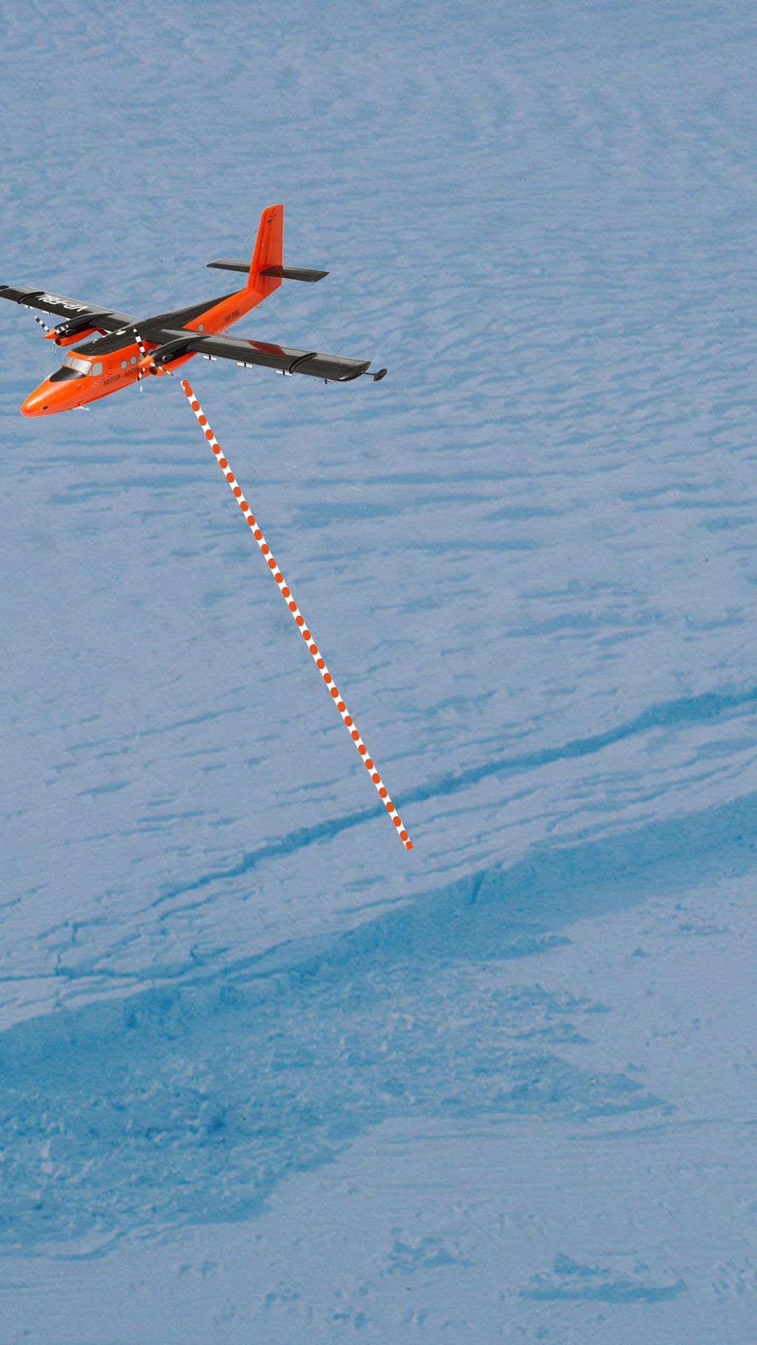 Ice and snow allow radio waves at certain frequencies to pass right through them, but they cannot pass through the bedrock below the ice, so an echo bounces back. The SPRI scientists invented a device which they mounted on an aeroplane to emit and receive radio waves. By measuring the time between the wave being emitted and the echo bouncing back to the receiver, they could work out the depth of the ice they were flying over. Working with the US National Science Foundation, and later the Technical University of Denmark, from 1967-79 SPRI scientists revealed much of the buried landscape of Antarctica using this method. Radio-echo sounding continues to be important today, as understanding the shape of the bedrock, and consequently the flow of ice into the sea, helps to map the effects of climate change on the Antarctic continent.