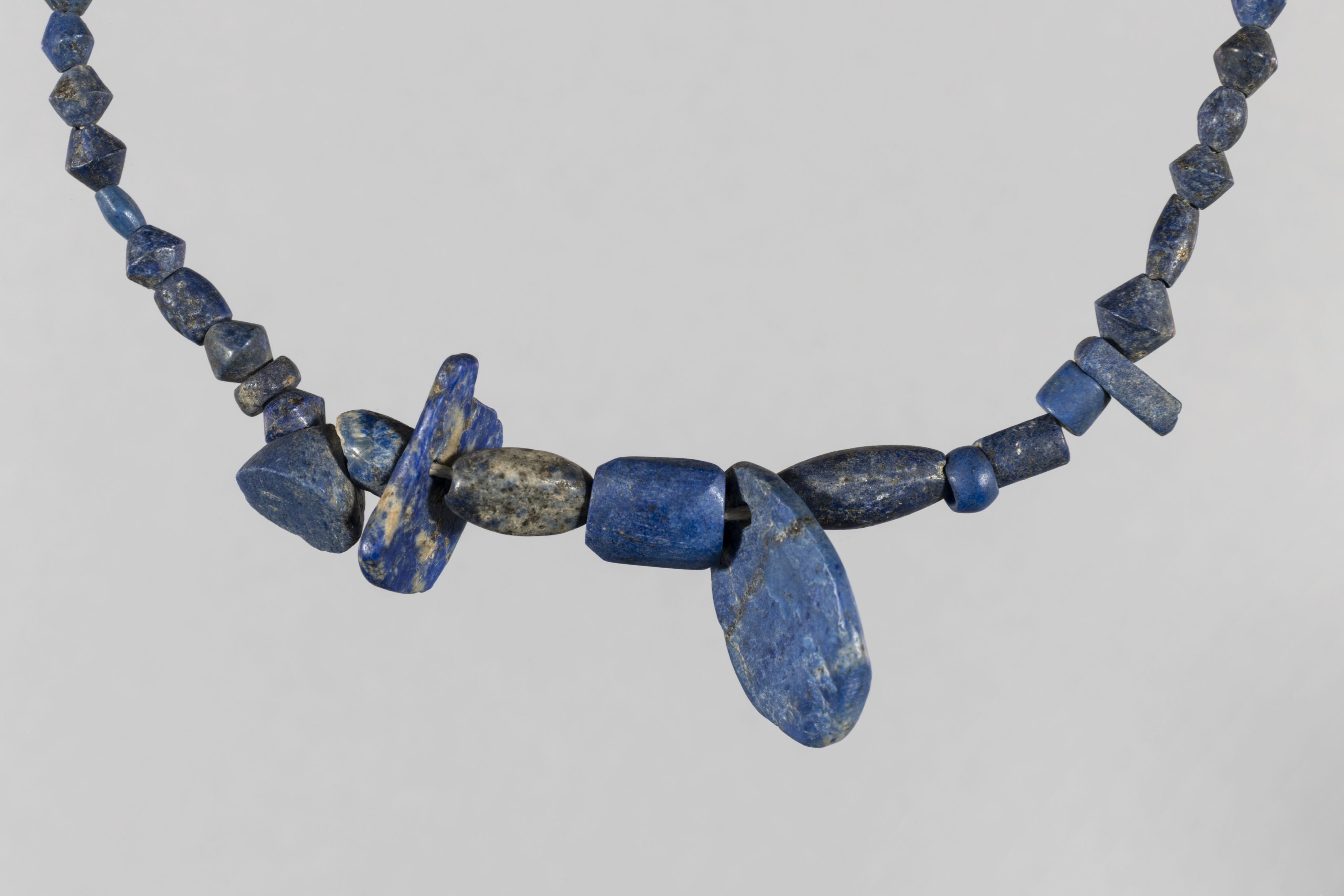 Necklace, Mesopotamia, Ur, circa 3000 BCE. Composed of irregularly shaped beads made from lapis lazuli, re-strung on a modern cord. Horace Beck Collection. MAA 1947.2079