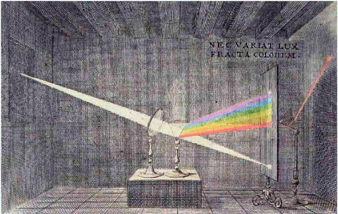 From 1664 Cambridge scholar Isaac Newton (1642-1726) conducted a series of famous experiments, where he directed a beam of sunlight to pass through a prism inside a darkened room. He drew on the idea that the eye is like a pinhole camera.