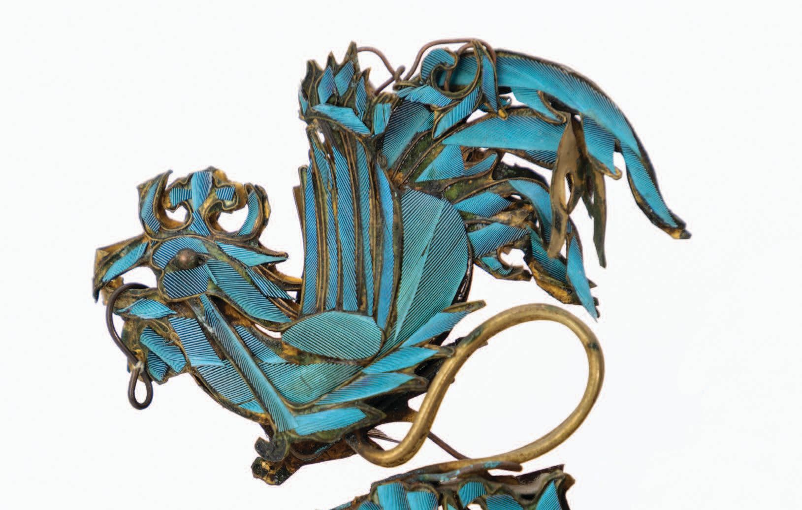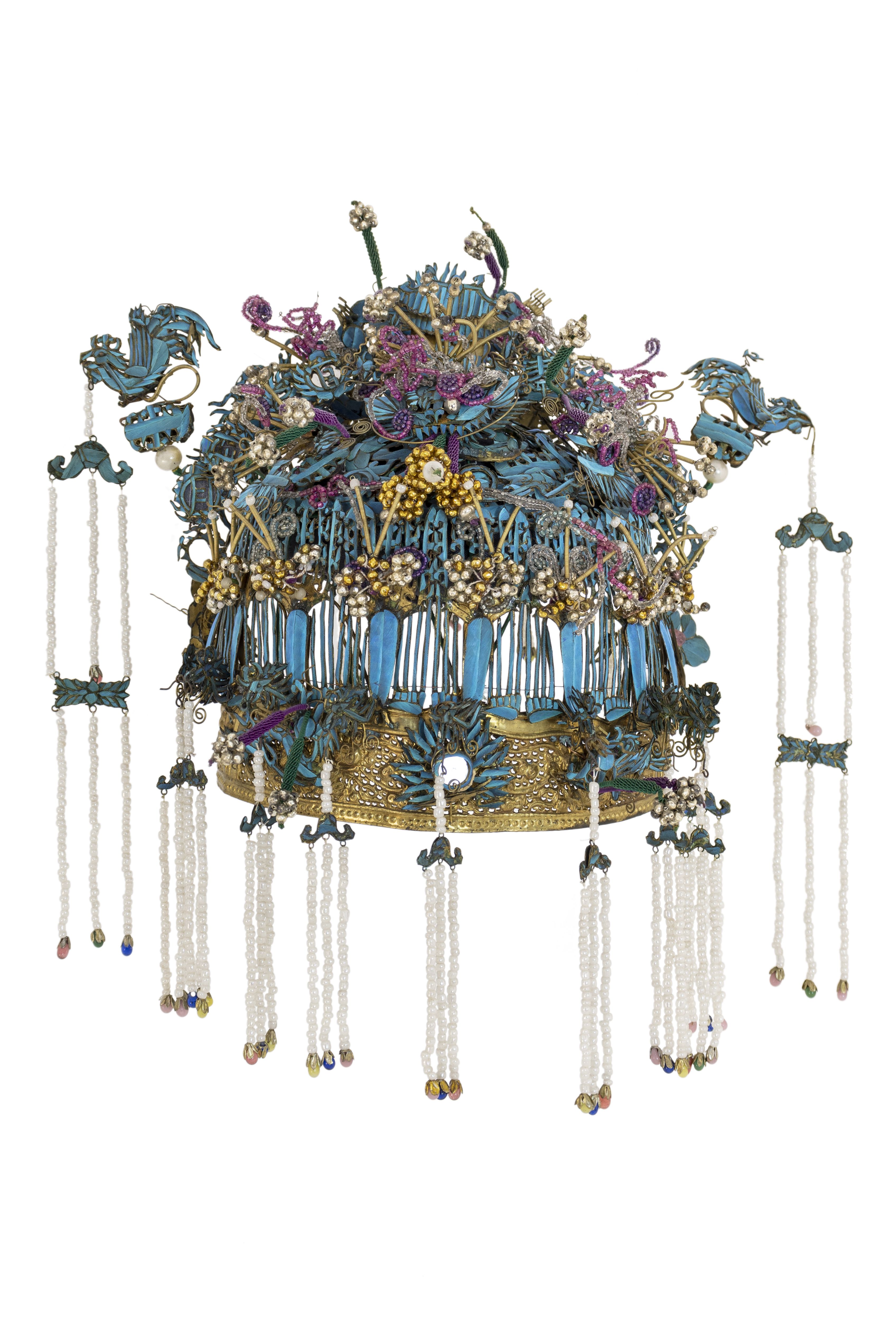 The right to wear this headdress was conferred upon its owner by the imperial court. It is decorated with sections of iridescent blue kingfisher feather inlay. This style of decoration, called diancui, was popular in China for over 2000 years.