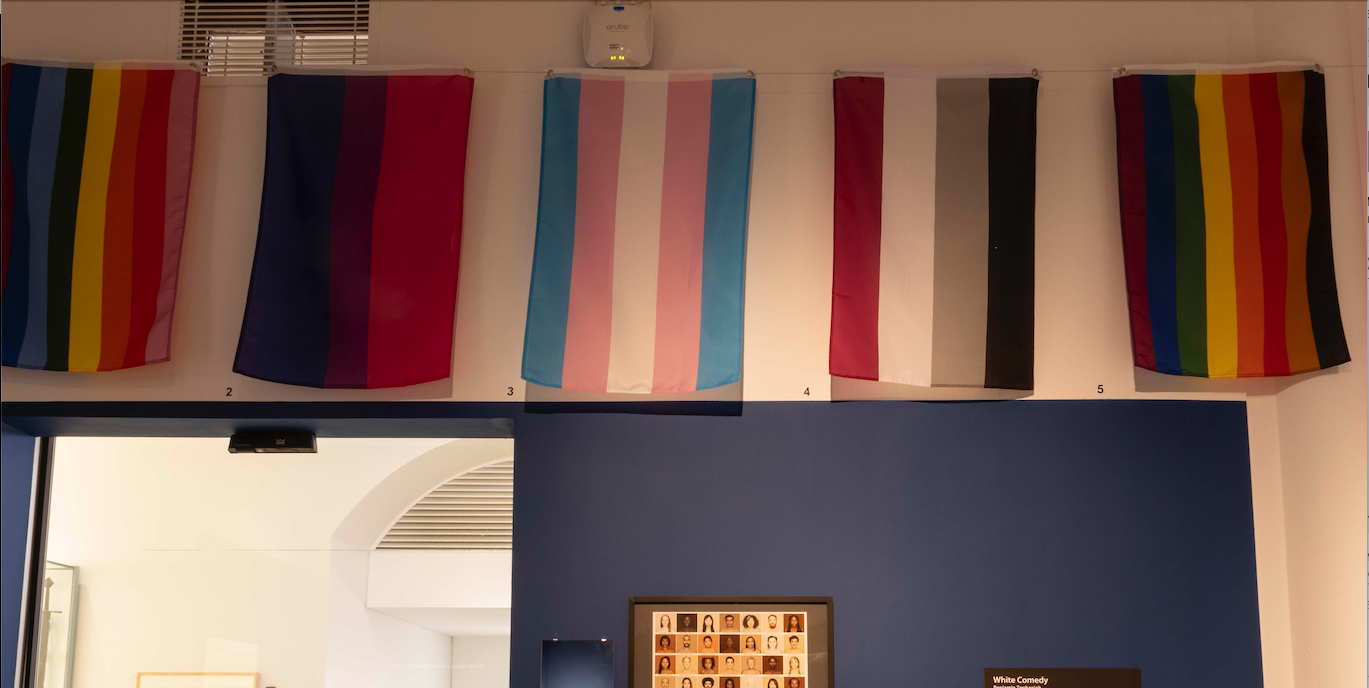 These flags, displayed on the closing wall of the exhibition, were chosen by Rosa Colaço, Ange La Furcia and Jade Pollard-Crowe, Cambridge-based Queer People of Colour.