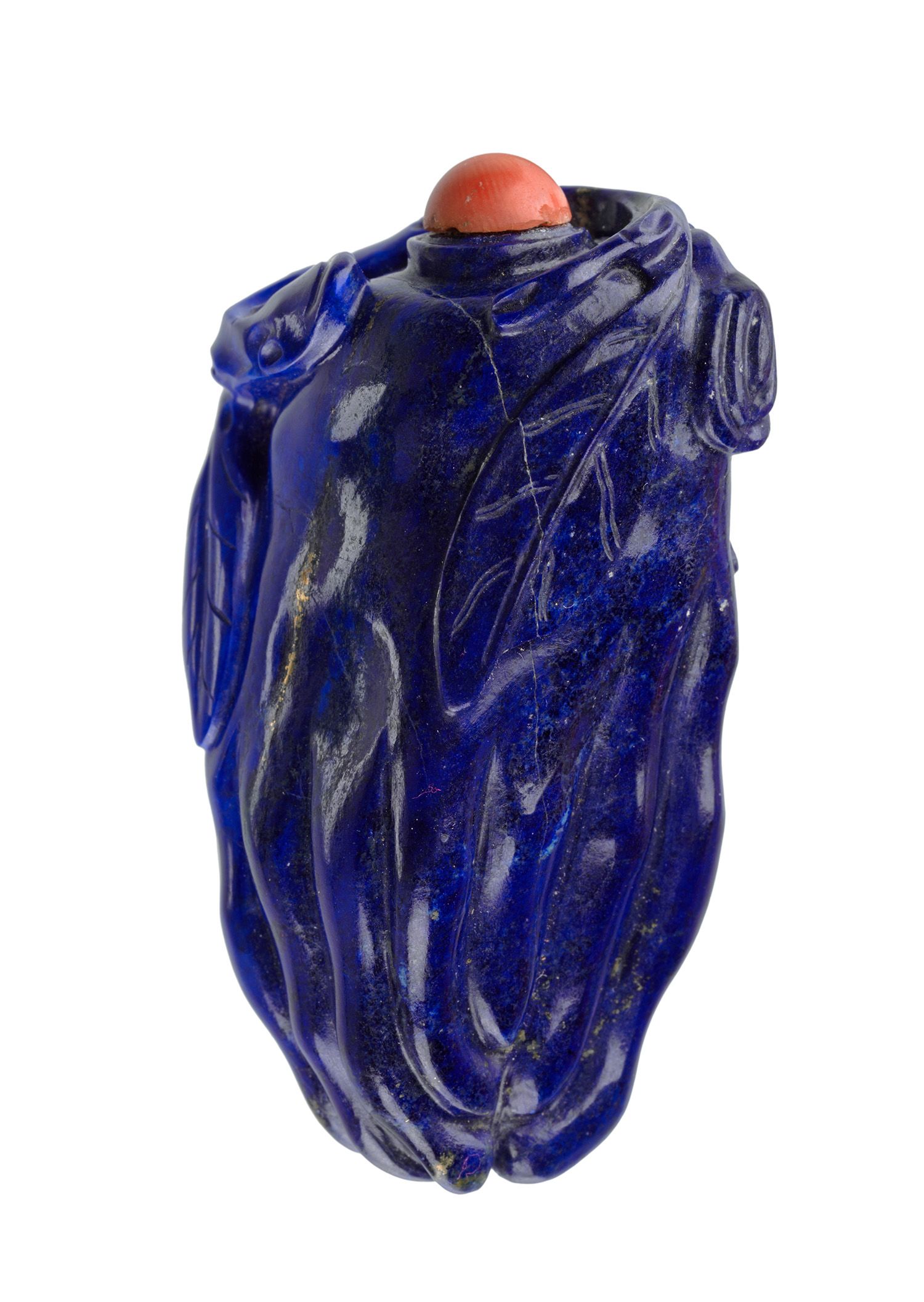 Snuff bottle, China, 19th century. Carved from a solid piece of lapis in the shape of a buddha's hand fruit, with leaves in relief. Polished red coral stopper attached to a small bone spoon. C.B. Marlay bequest. Fitzwilliam Museum MAR.0.281