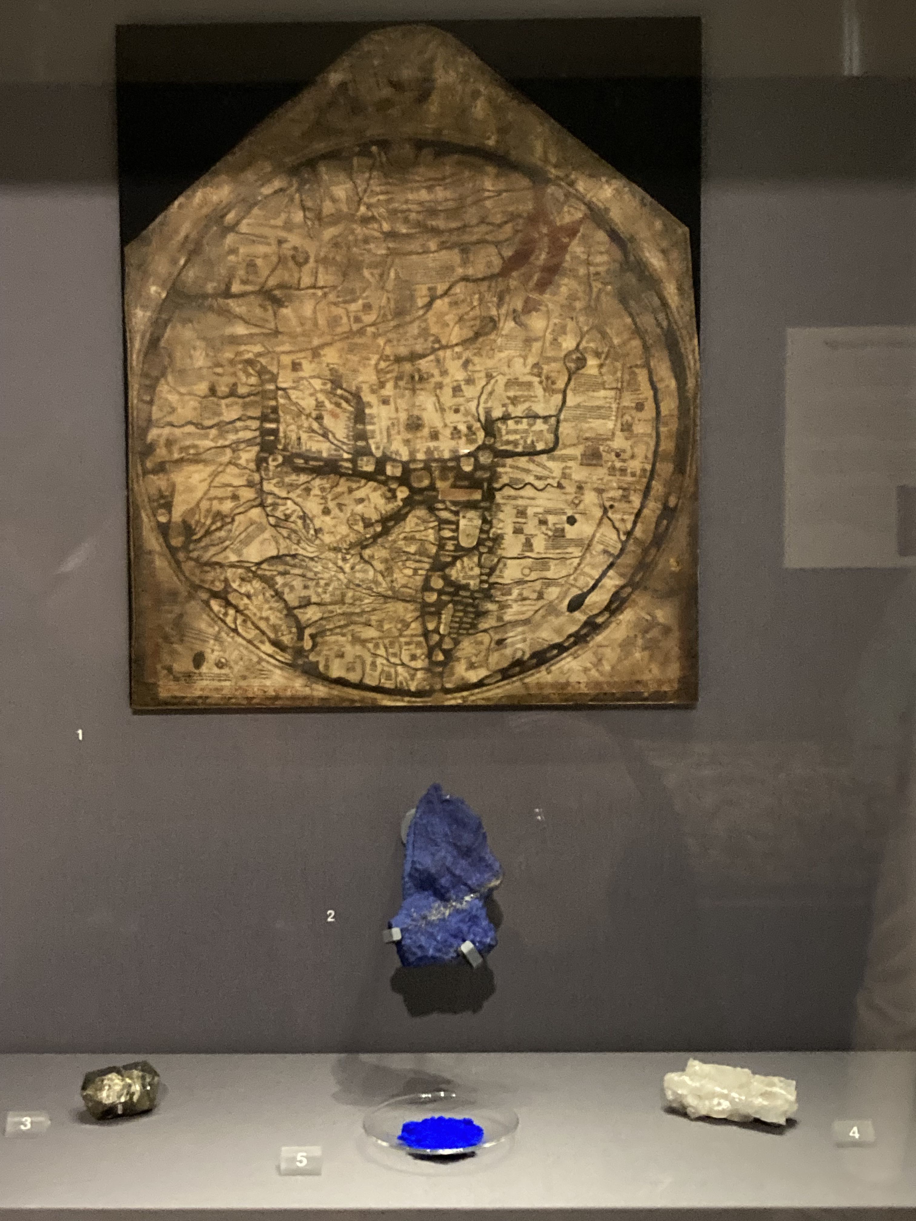 Ultramarine is purified from lapis lazuli (top centre) by extracting pyrite (left) and calcite (right). Behind is a reproduction of the Mappa Mundi in Hereford Cathedral (circa 1300) with east at the top. Afghanistan, the source of lapis, is in the direction of paradise. Loans from Spike Bucklow and the Sedgwick Museum.