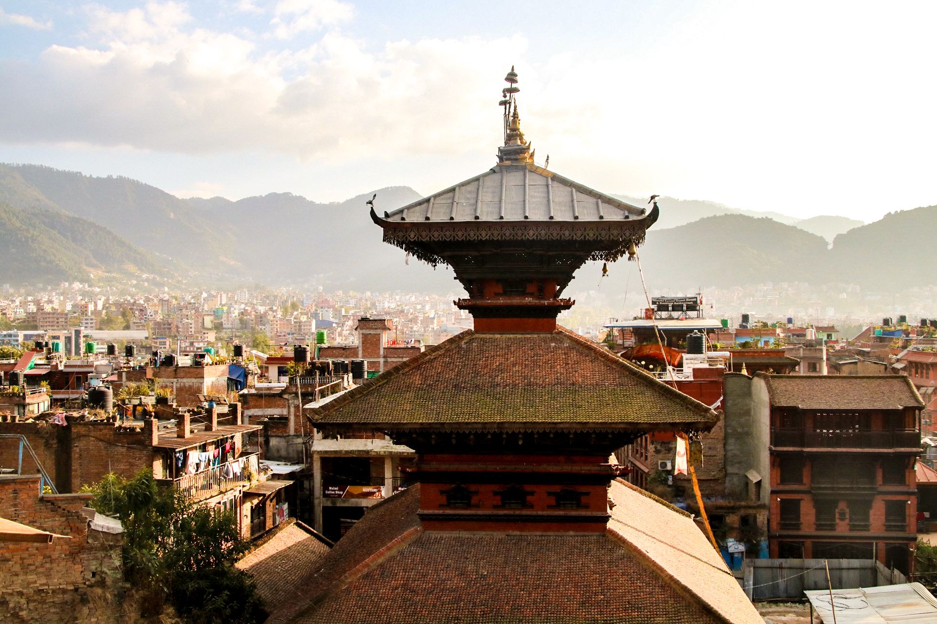 Bhaktapur's skyline with its towering shikhara and pagoda style roofs, 2021.