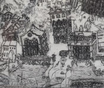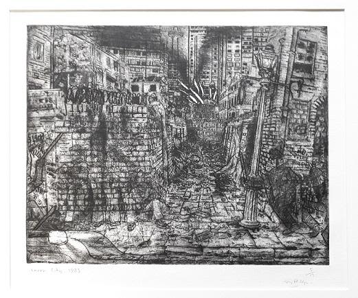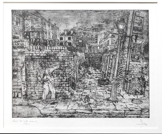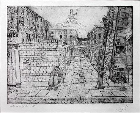 The series centres on a back alley in the Liverpool 8 area, which gradually falls into disrepair as the city grows around it. With each reworking, the etchings become increasingly dense and frenetic: the sky is gradually eclipsed by the rising built environment, and the images take on a progressively more claustrophobic atmosphere.