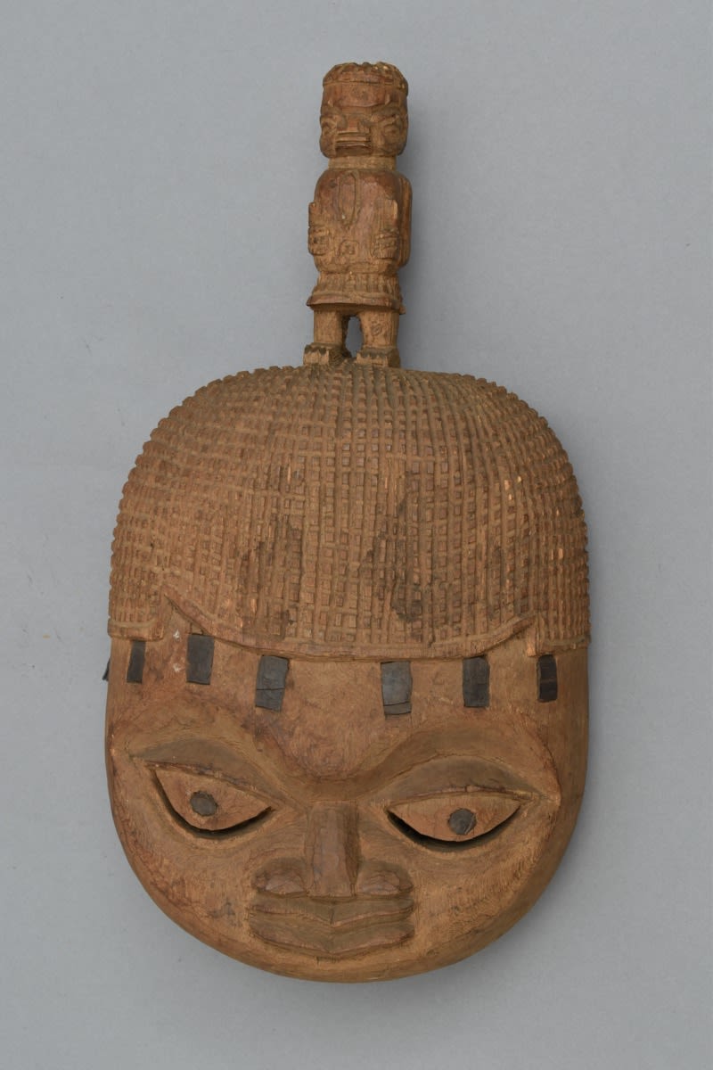 Egbo, carved wooden face mask with a small figure standing on top. Wood, Benin City, Edo State, Nigeria. Acquired by Northcote Whitridge Thomas, donated by Professor Anthony Ashley Bevan. MAA Z 12090.