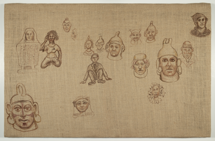 Untitled hessian panel with ink featuring Moche pots by Tony Phillips 2021 (Moche Pots II). Part of 'Civilisations.' Europe; Italy. 21st century. MAA 2023.29