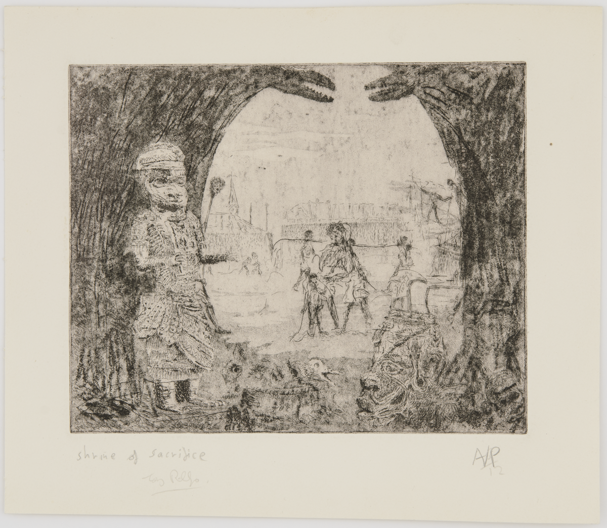 Etching titled Shrine of Sacrifice (1984) by Tony Phillips. Third image in the suite of twelve plates The History of the Benin Bronzes. England, 20th century. MAA 2020.13.2.