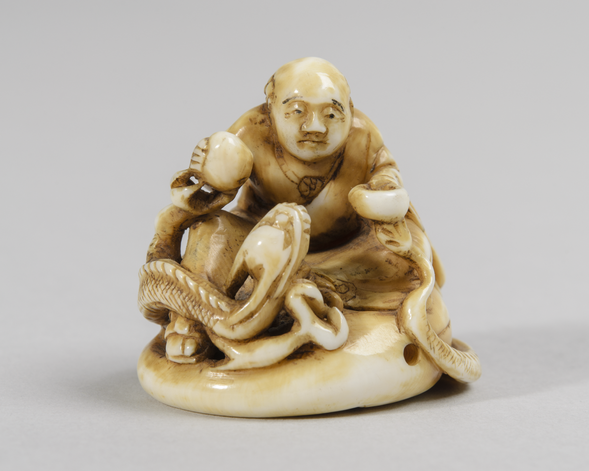 Netsuke. Ivory carving of a man, seated cross legged, feeding a dragon. 17th Century. Japan. Bequeathed by Professor Sir William Ridgeway. MAA 1927.830 A