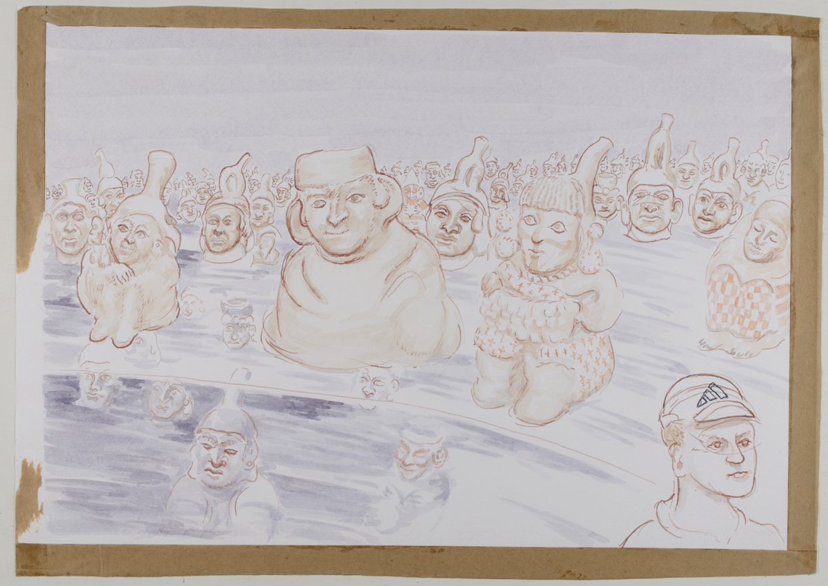 Tony also created a pen-and-wash drawing that reimagines the collection as an endless crowd of Moche vessels and faces. In the lower right corner, a man wearing an Adidas baseball cap extends this continuum of faces and headwear through time, linking ancient imagery with the contemporary world.