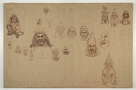 Untitled hessian panel with ink featuring Moche pots by Tony Phillips 2021 (Moche Pots I). Part of 'Civilisations.' Europe; Italy. 21st century. MAA 2023.30