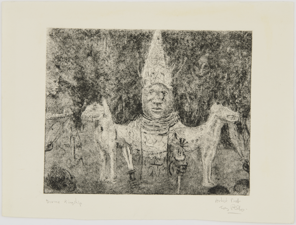 Etching titled Divine Kingship (1984) by Tony Phillips. Second image in the suite of twelve plates The History of the Benin Bronzes. England, 20th century. MAA 2020.13.1.