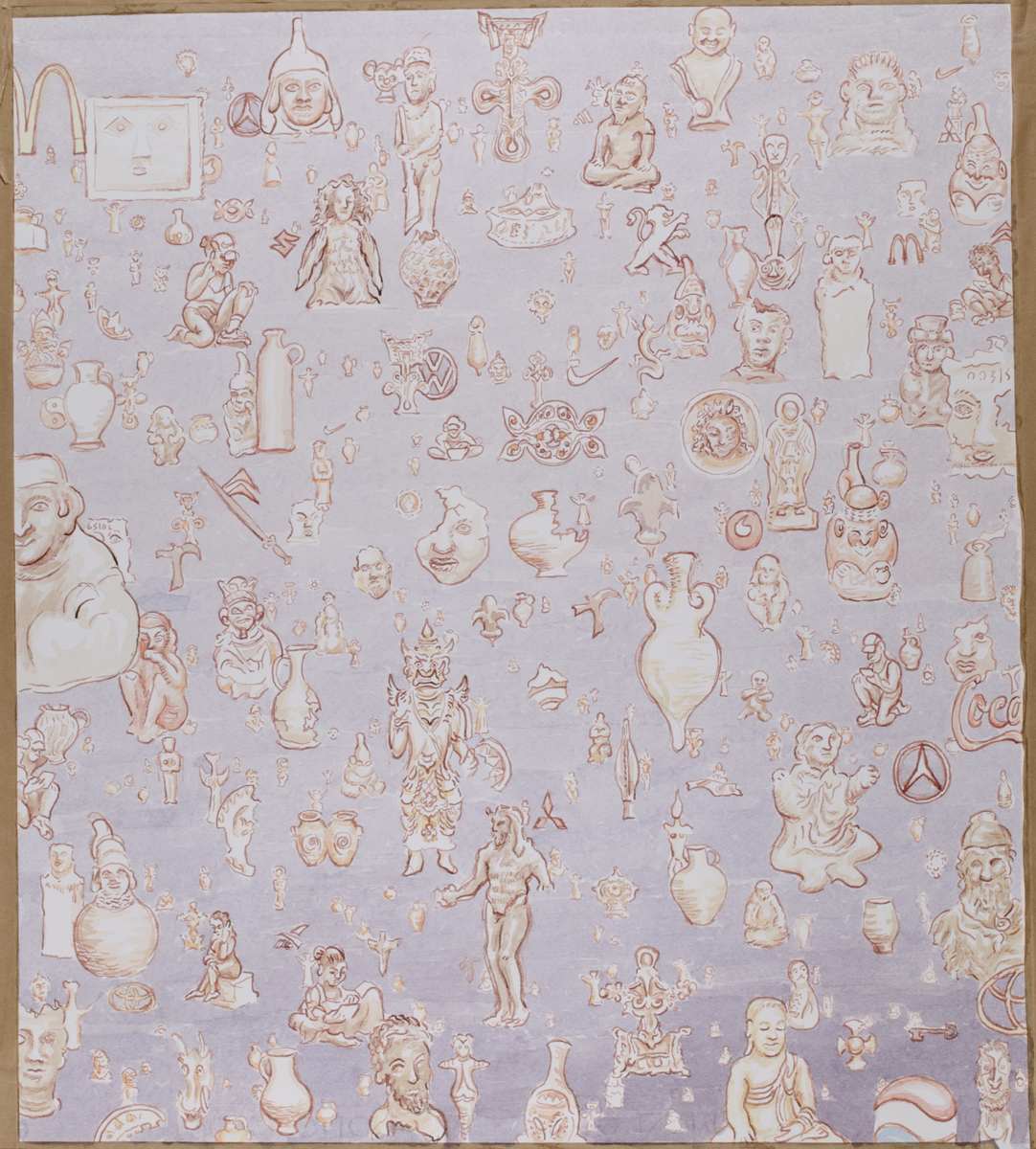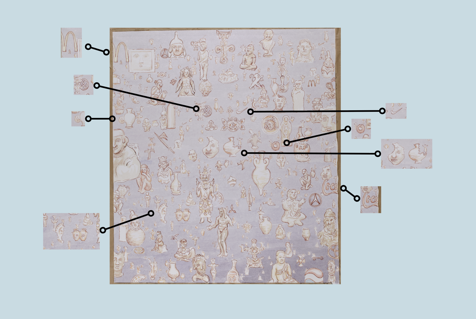 These artefacts are interwoven with a range of symbols, both historical and modern. The yin–yang motif appears alongside logos such as Vodafone, Nike, and Coca-Cola. For Tony, these symbols continue the visual narrative of time embodied by the collections in the Museum's care. Just as McDonald’s wrappers, Volkswagen cars, and Coca-Cola bottles circulate through the streets of Cambridge today, this drawing inserts the artefacts of contemporary consumer culture into dialogue with those of the past.