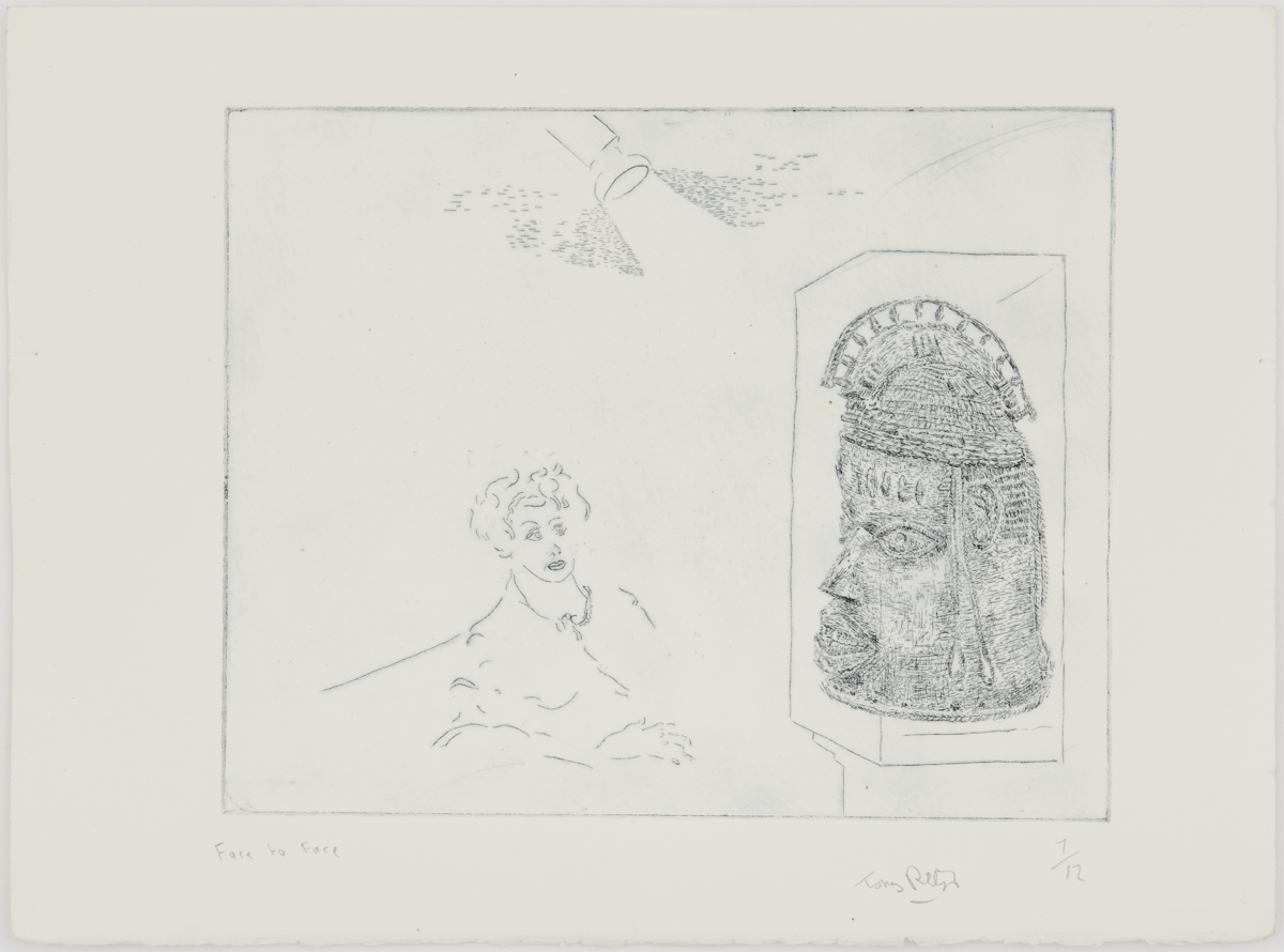 Etching titled Face to Face 1897 (1984) by Tony Phillips. Eleventh image in the suite of twelve plates The History of the Benin Bronzes. England, 20th century. MAA 2020.13.10.