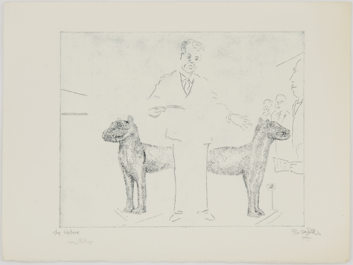 Etching titled The Lecture (1984) by Tony Phillips. Ninth image in the suite of twelve plates The History of the Benin Bronzes. England, 20th century. MAA 2020.13.7.