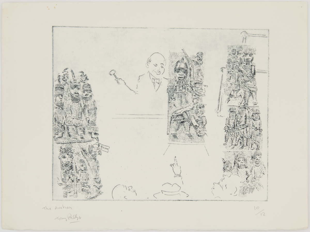 Tony is best known for his etching series History of the Benin Bronzes, which recounts the violence of the British Punitive Expedition of 1897 in Benin City and the subsequent dispersal of the Benin Bronzes into museums and private collections around the world. The series exposes the hypocrisy of British imperialism, which portrayed African peoples as “savages” in the British press while simultaneously declaring their cultural artefacts to be prestigious works of art “worthy” of display in distinguished institutions such as the British Museum.