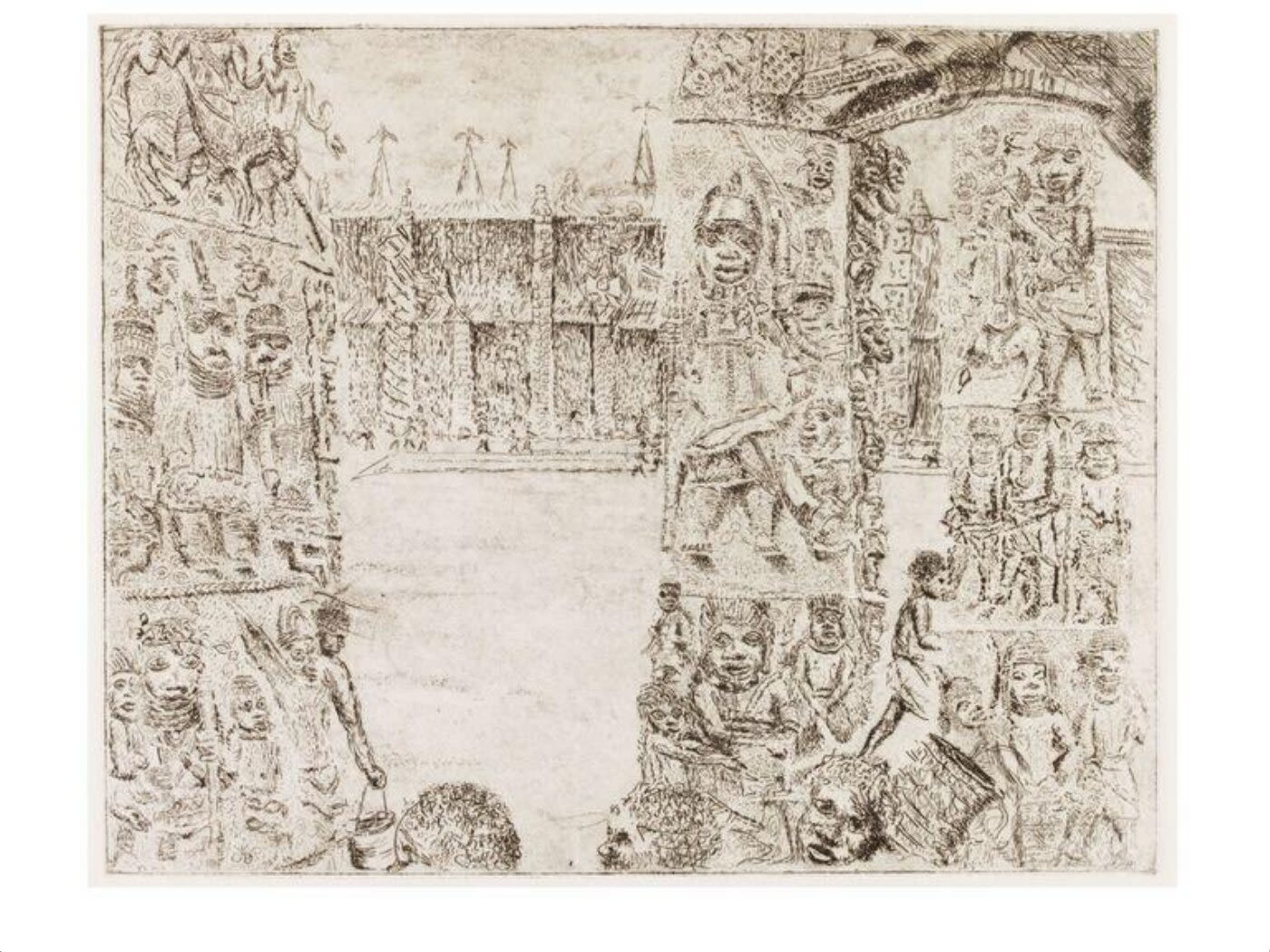 Etching titled The Oba’s Palace (1984) by Tony Phillips. Fourth image in the suite of twelve plates The History of the Benin Bronzes. England, 20th century. Victoria and Albert Museum, London. Accession no. E.51-1987.