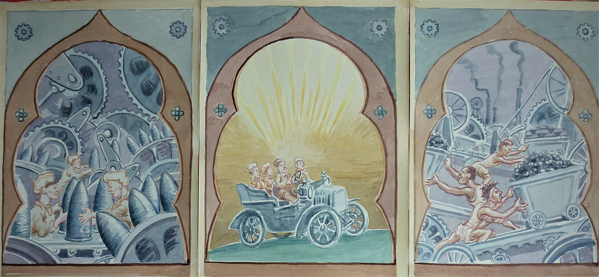 These designs draw together motifs Tony developed while working on his earlier project Guide to the Twentieth Century (completed in 1999). The frescoes present recent historical events as though they were artefacts from a distant culture, inviting viewers to reflect on the twentieth century with the detachment of an external observer. Framed by arches and adorned with cogs, the ‘sacred’ scene elevates the achievements of innovation and progress, presenting them as objects of veneration akin to a holy pursuit.