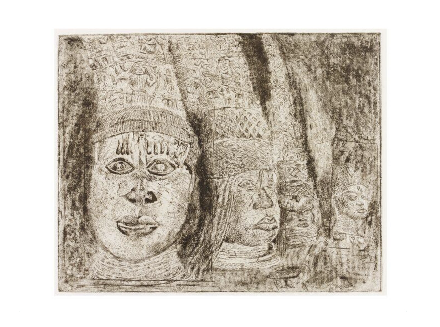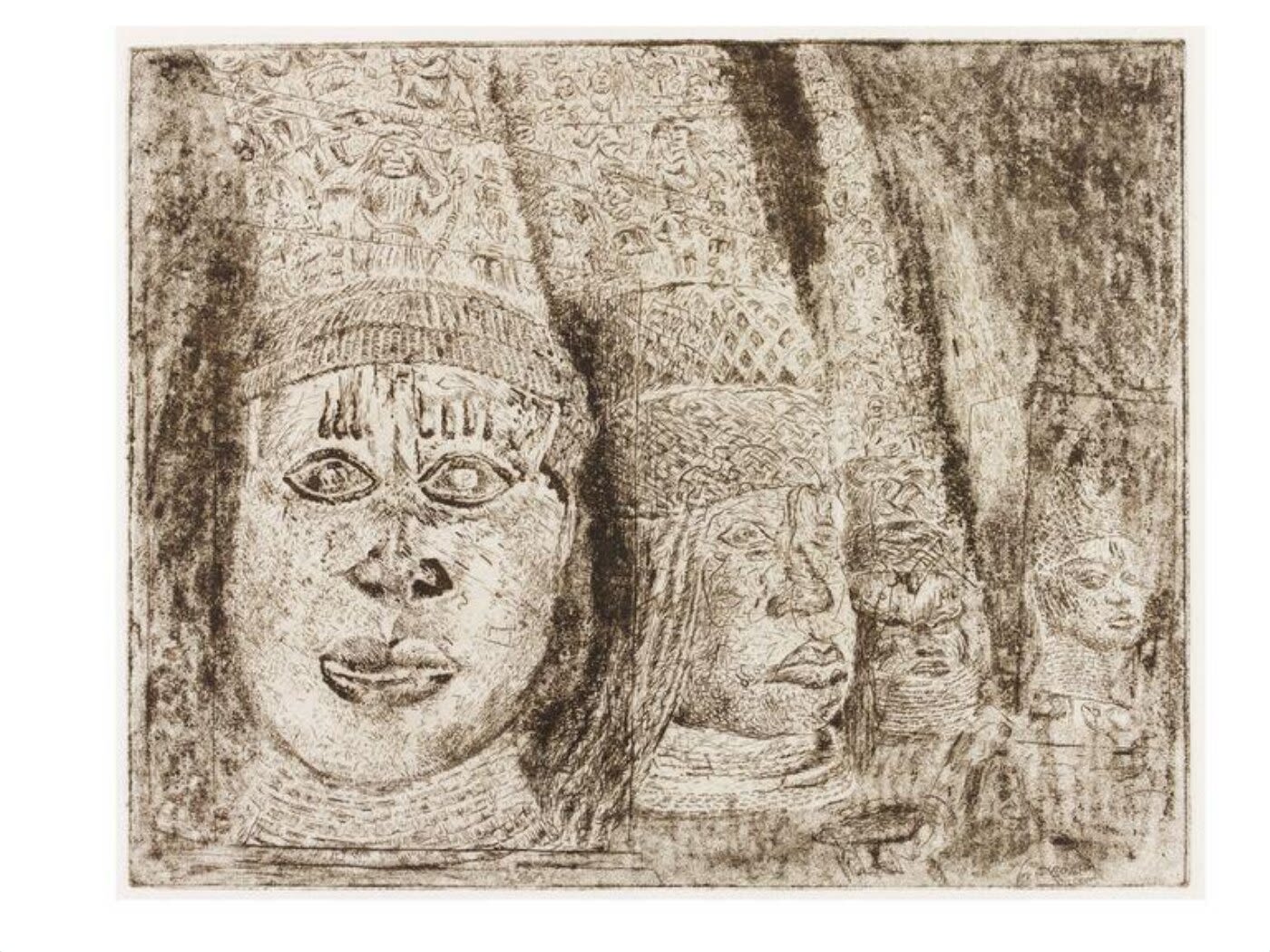 Etching titled Ancestral Heads (1984) by Tony Phillips. First image in the suite of twelve plates The History of the Benin Bronzes. England, 20th century. Victoria and Albert Museum, London. Accession no. E.48-1987.