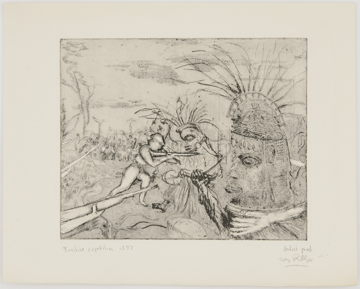 Etching titled Punitive Expedition 1897 (1984) by Tony Phillips. Sixth image in the suite of twelve plates The History of the Benin Bronzes. England, 20th century. MAA 2020.13.4.