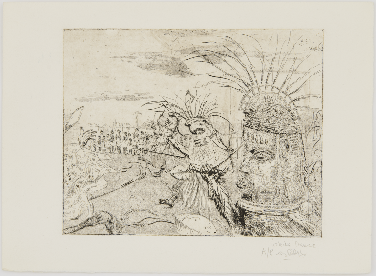 Etching titled Ododua Dance (1984) by Tony Phillips. Fifth image in the suite of twelve plates The History of the Benin Bronzes. England, 20th century. MAA 2020.13.3.