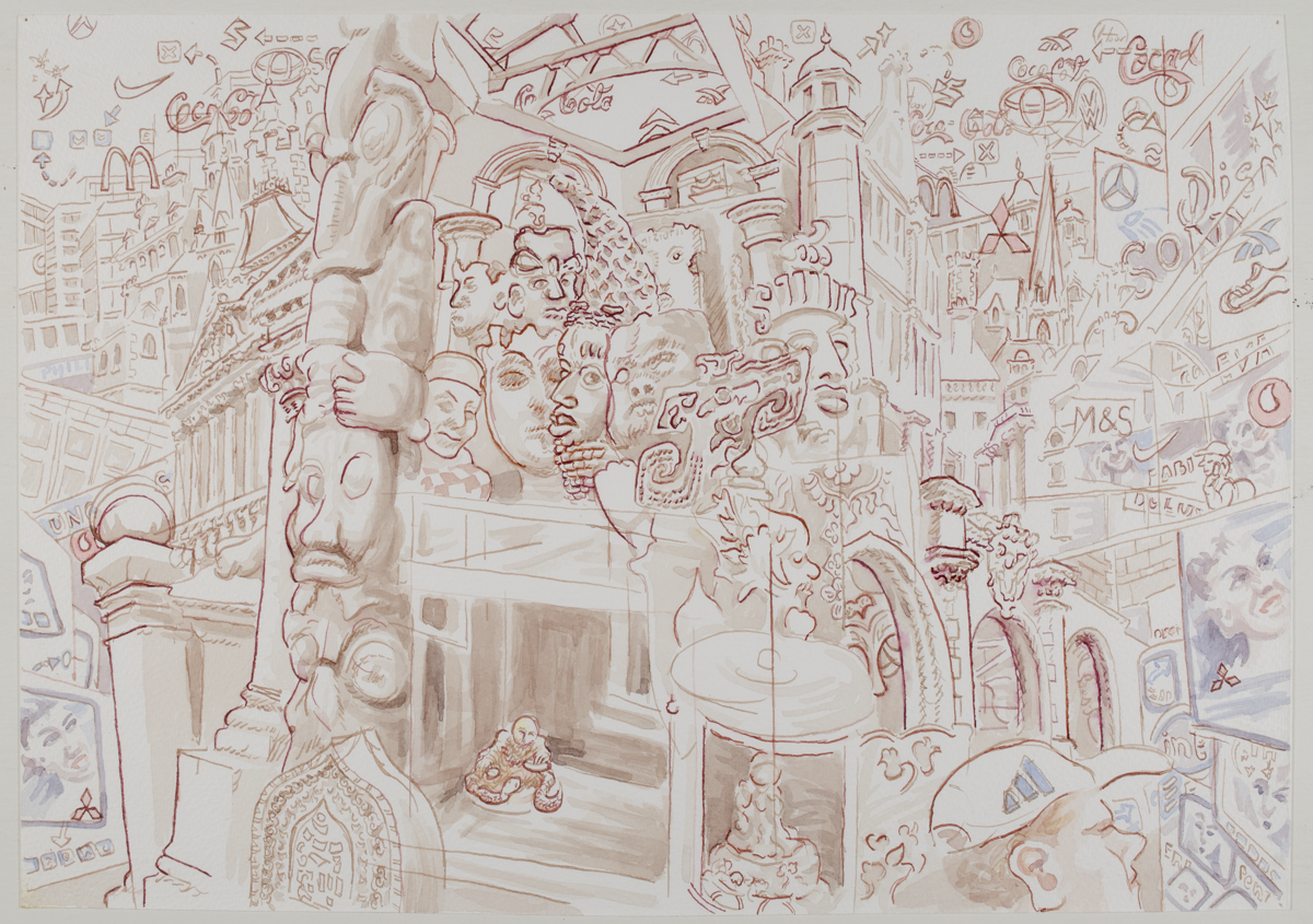 The delicate, intricate individuality of each object Tony depicts inside MAA is sharply contrasted with the repeated symbols surrounding the building. Coca-Cola appears five times, Vodafone four, and Mitsubishi three. These images are mass-produced to such an extent that they have become inescapable; they exert a dominance unmatched by earlier forms of symbolism. Power is now communicated through sheer repetition and ubiquity rather than any inherent meaning in the symbol itself.