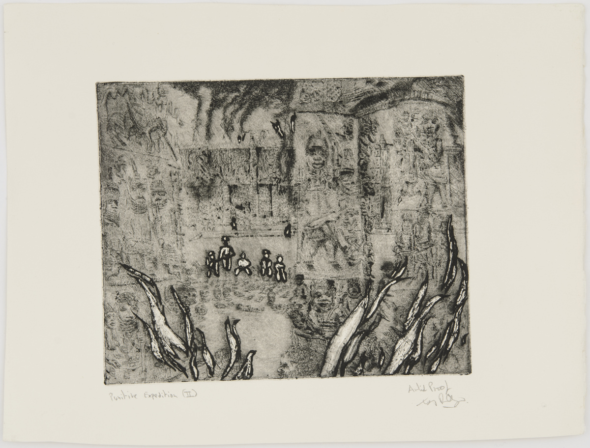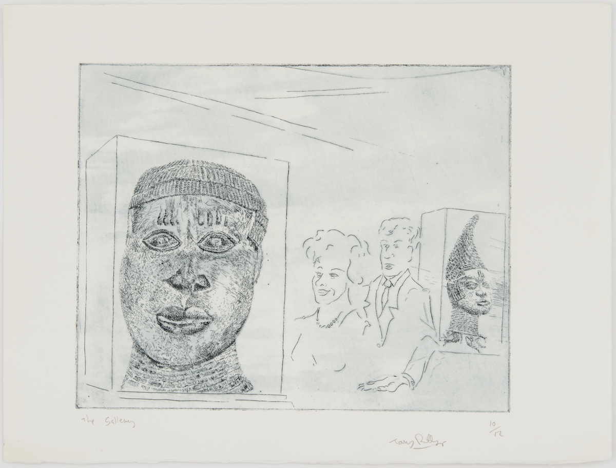 Etching titled The Gallery, 1984 by Tony Phillips. Tenth image in the suite of twelve plates, 'The History of the Benin Bronzes'. England. 20th century. MAA 2020.13.8