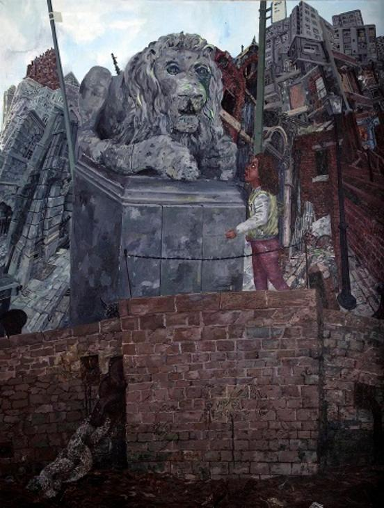 At the centre of the painting stands a stone lion towering over a young girl. The lion, emblematic of the British Empire, appears immovable and monumental when set against the girl’s youth and fragility—an image evoking the relationship between Britain and its colonies. Tony elaborates on this symbolism, stating that ‘the lion is a symbol of the hierarchical order of the environment in which she is growing up.’ Yet the lion also bears signs of erosion: notches mark its surface and moss gathers on its nose. As the lion – the Empire and its hierarchies – slowly wears down, the girl retains the capacity to grow, adapt, and ultimately transform the conditions of the world she inhabits.