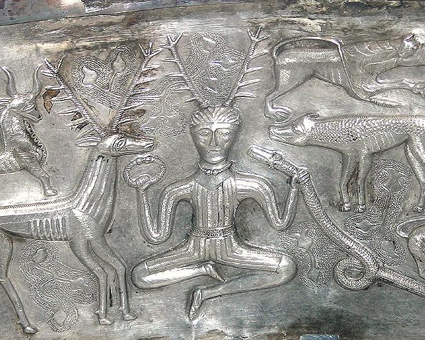 Detail of the Celtic god Cernunnos from an interior panel of the Gundestrup Cauldron. Gilded Silver. 1st century BCE. National Museum of Denmark, Copenhagen. Source: Nationalmuseet.