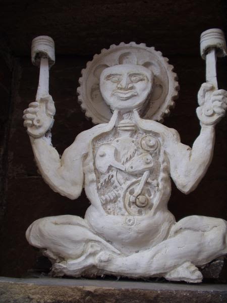 The plaques frame a curious deity posed in a manner reminiscent of the Celtic god Cernunnos as pictured on the Gundestrup Cauldron, a richly decorated silver vessel thought to date from between 200 BCE and 300 CE. Seated cross-legged, the figure’s torso is opened to reveal an inner mechanical mechanism, and where a halo might traditionally appear sits a large cog, its spokes standing in for rays of light.