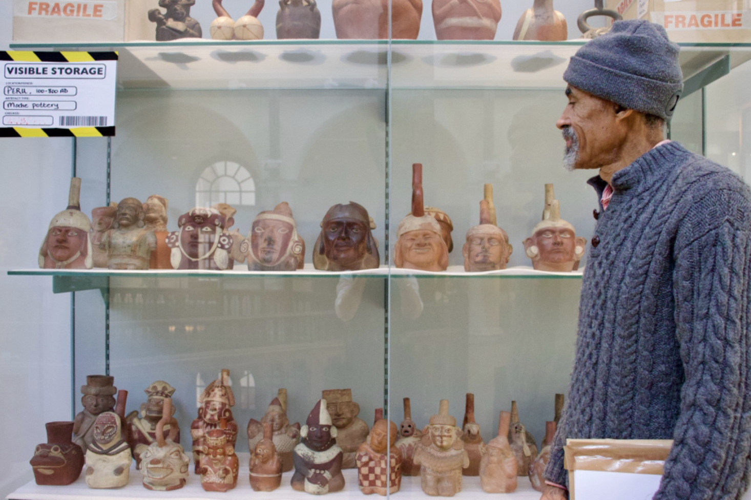 Tony created painted backdrops for the display case, combining faces inspired by Moche pottery with those drawn from different periods and cultures.