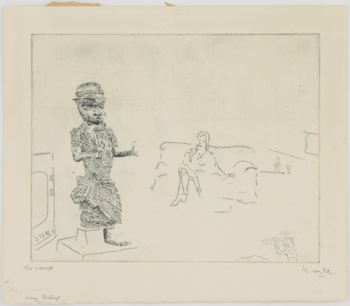 Etching titled The Lounge (1984) by Tony Phillips. Eleventh image in the suite of twelve plates The History of the Benin Bronzes. England, 20th century. MAA 2020.13.9.