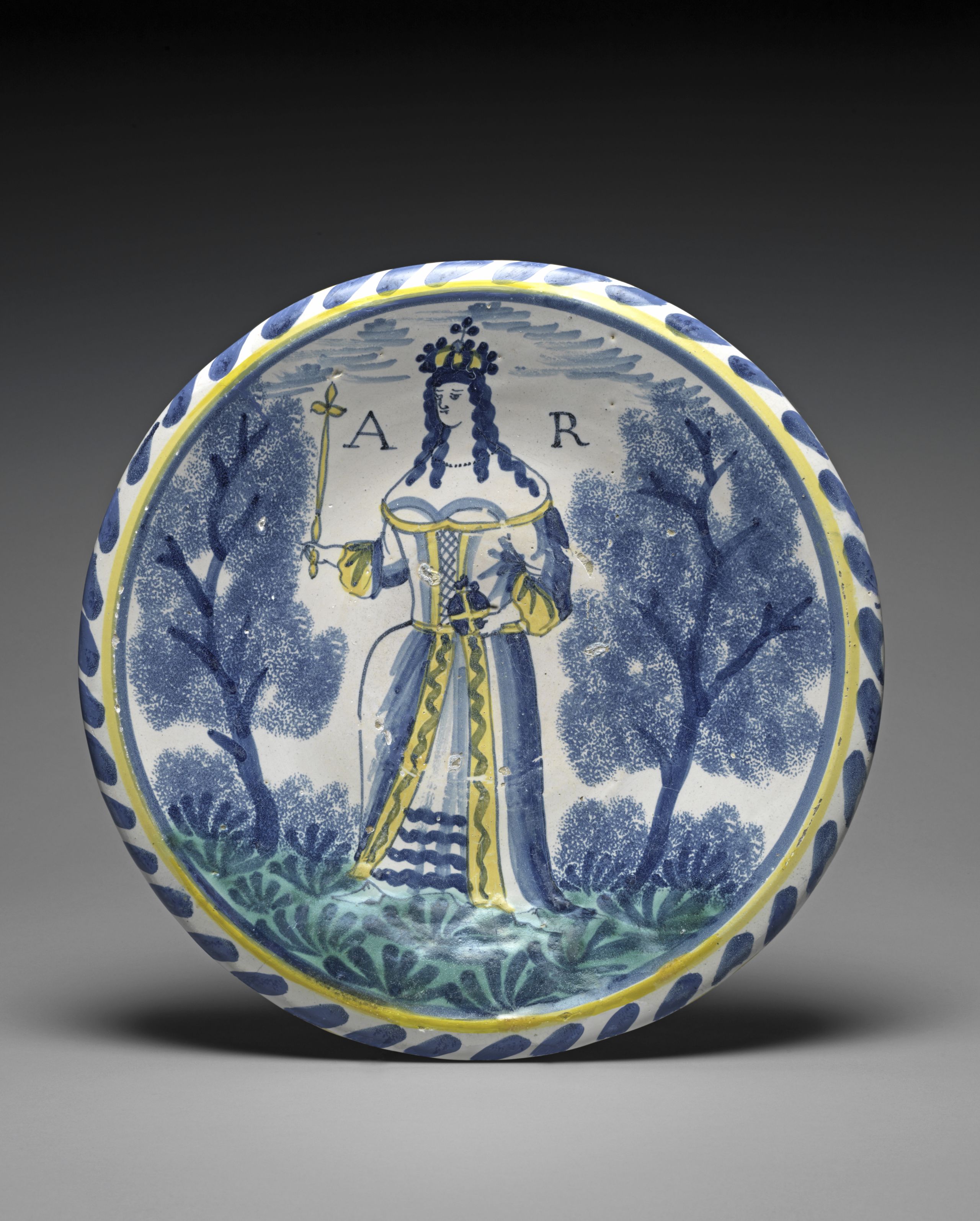 Plates. 2019. Part of a dinner service depicting Queen Anne, Sarah Churchill and Abigail Masham. Pictured also is Queen Anne's husband Prince George of Denmark.