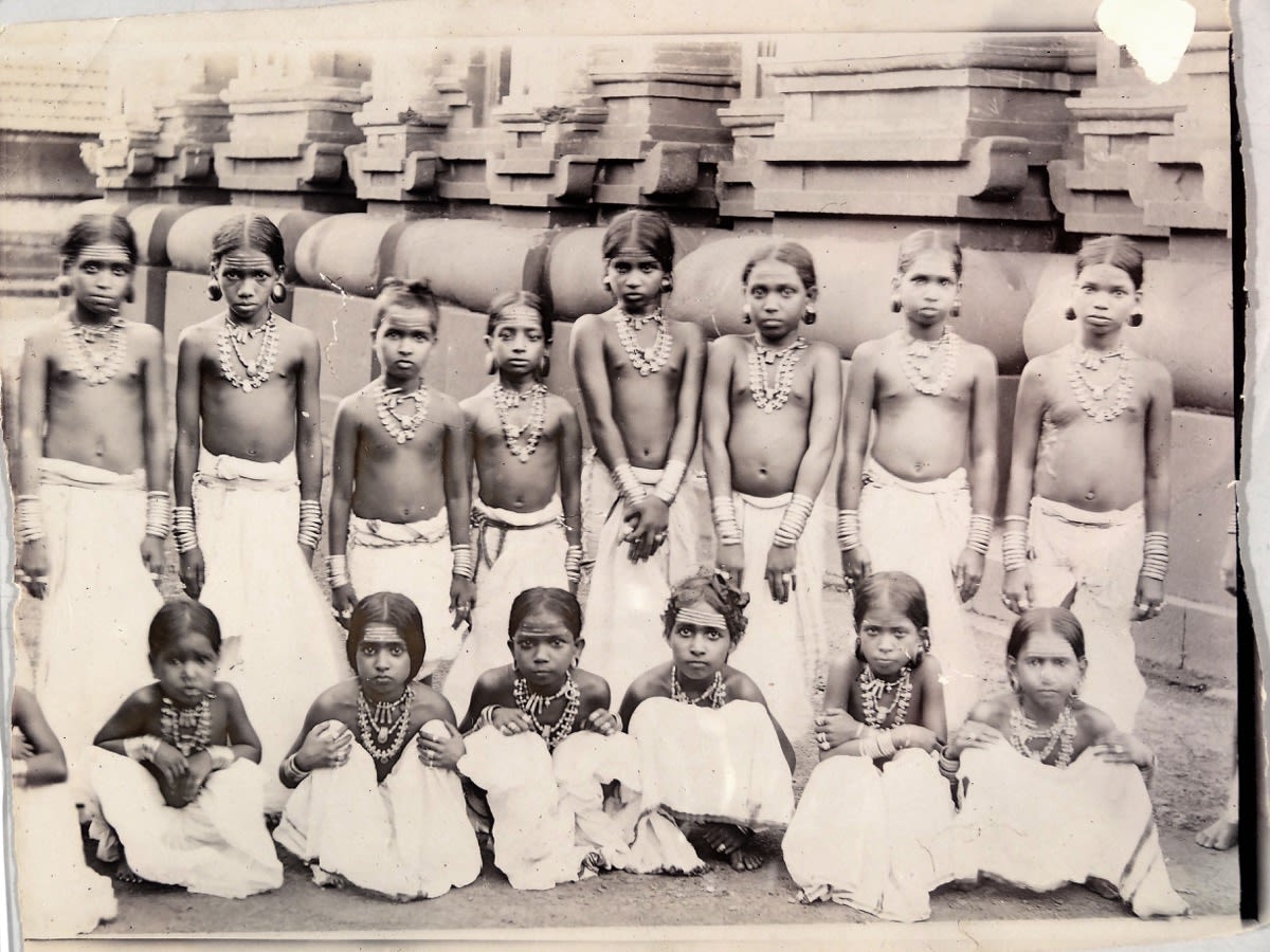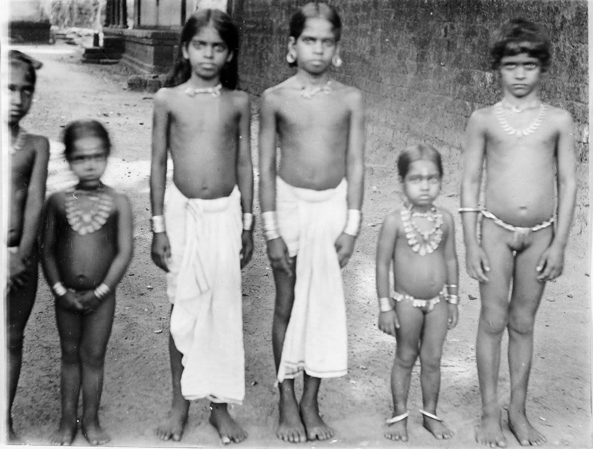 Namboothiri girls pose in front of the Peruvanam Mahadeva Temple. Photograph by L. K. Ananthakrishna Iyer. c. 1901-1908. MAA P.36570.ACH2