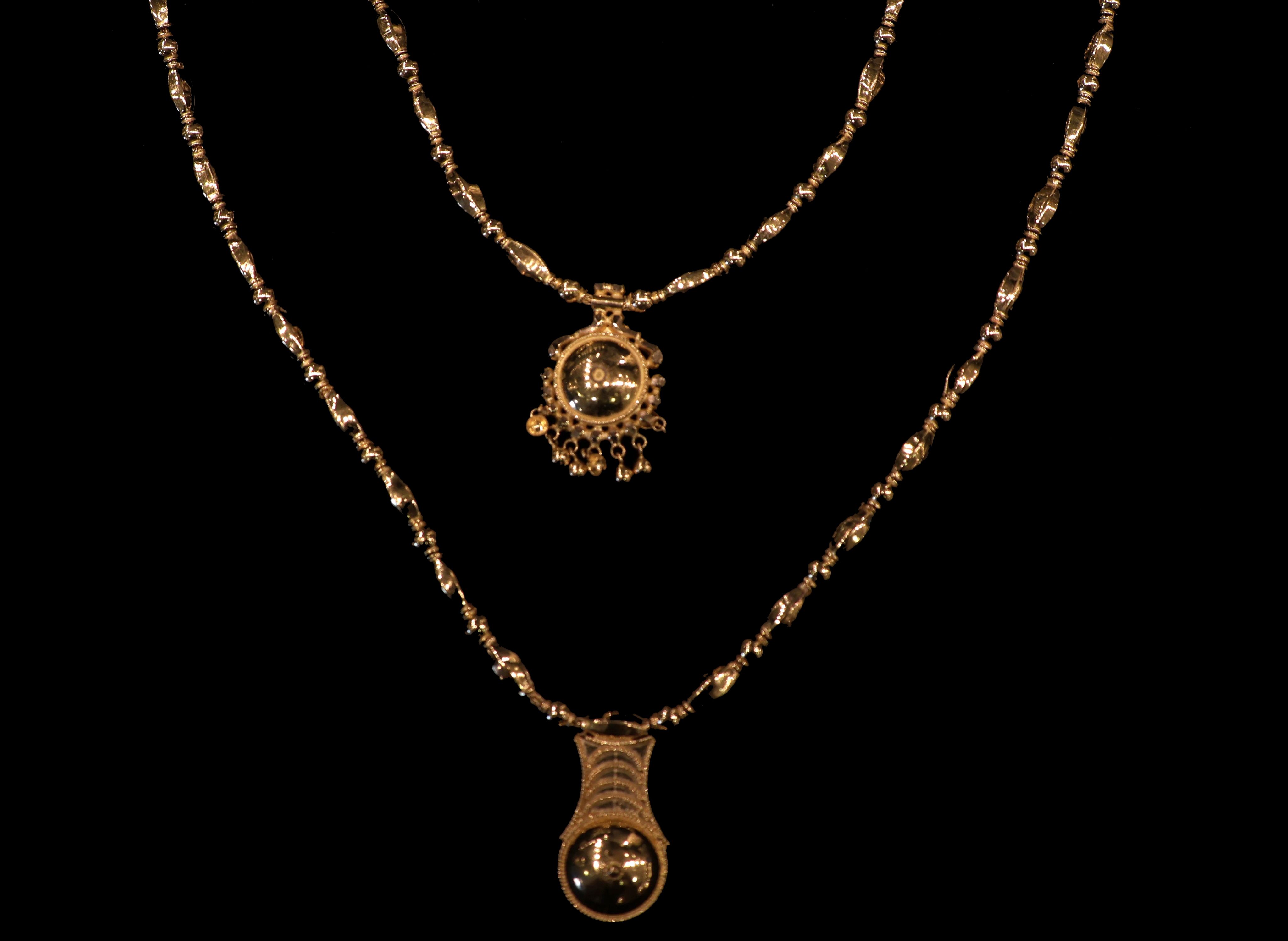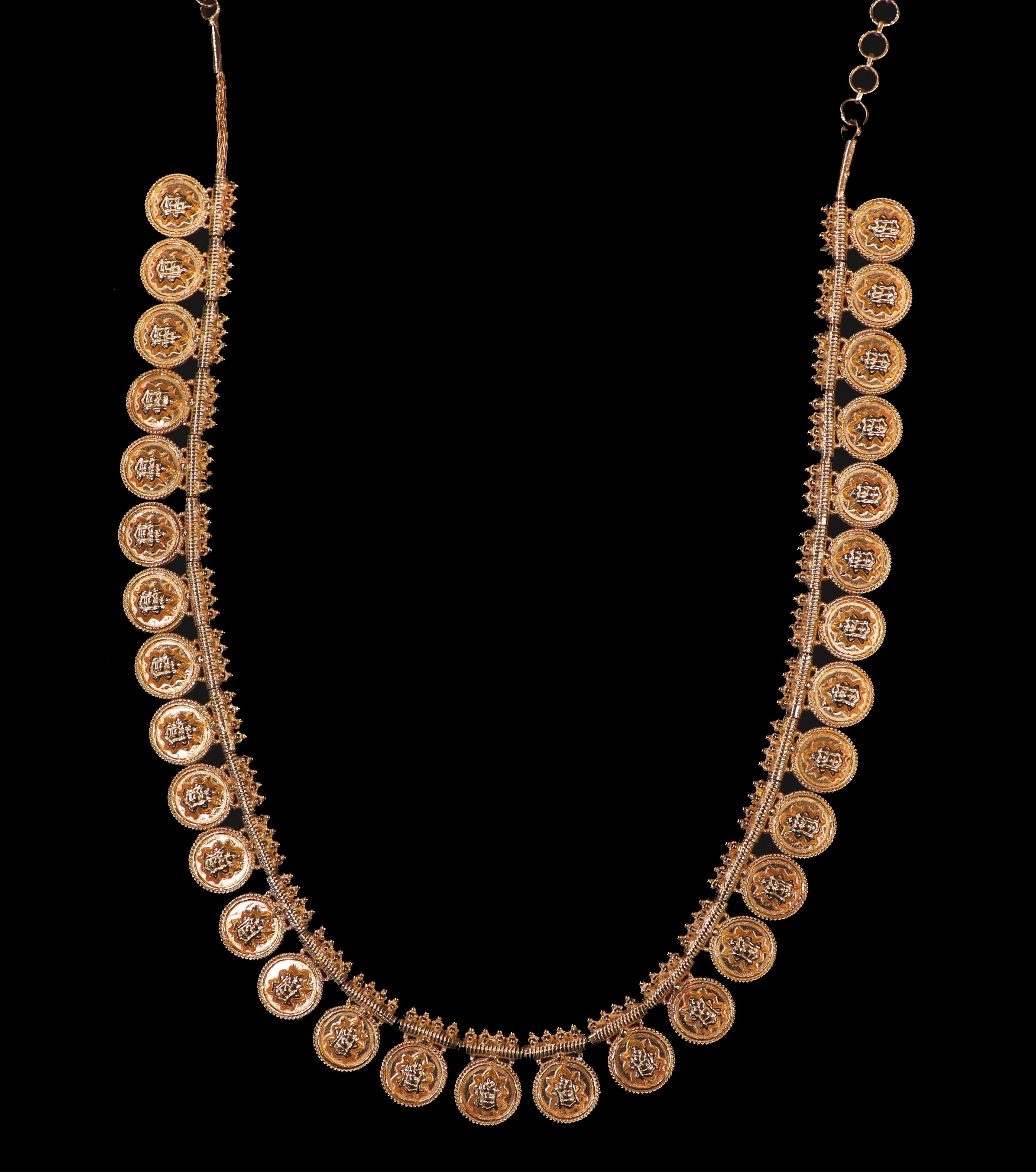 The kasumala was popular among Nairs and Namboothiris. It consists of numerous gold coins with religious motifs—often depicting Lakshmi, the goddess of wealth—strung together. It was worn as a symbol of affluence.