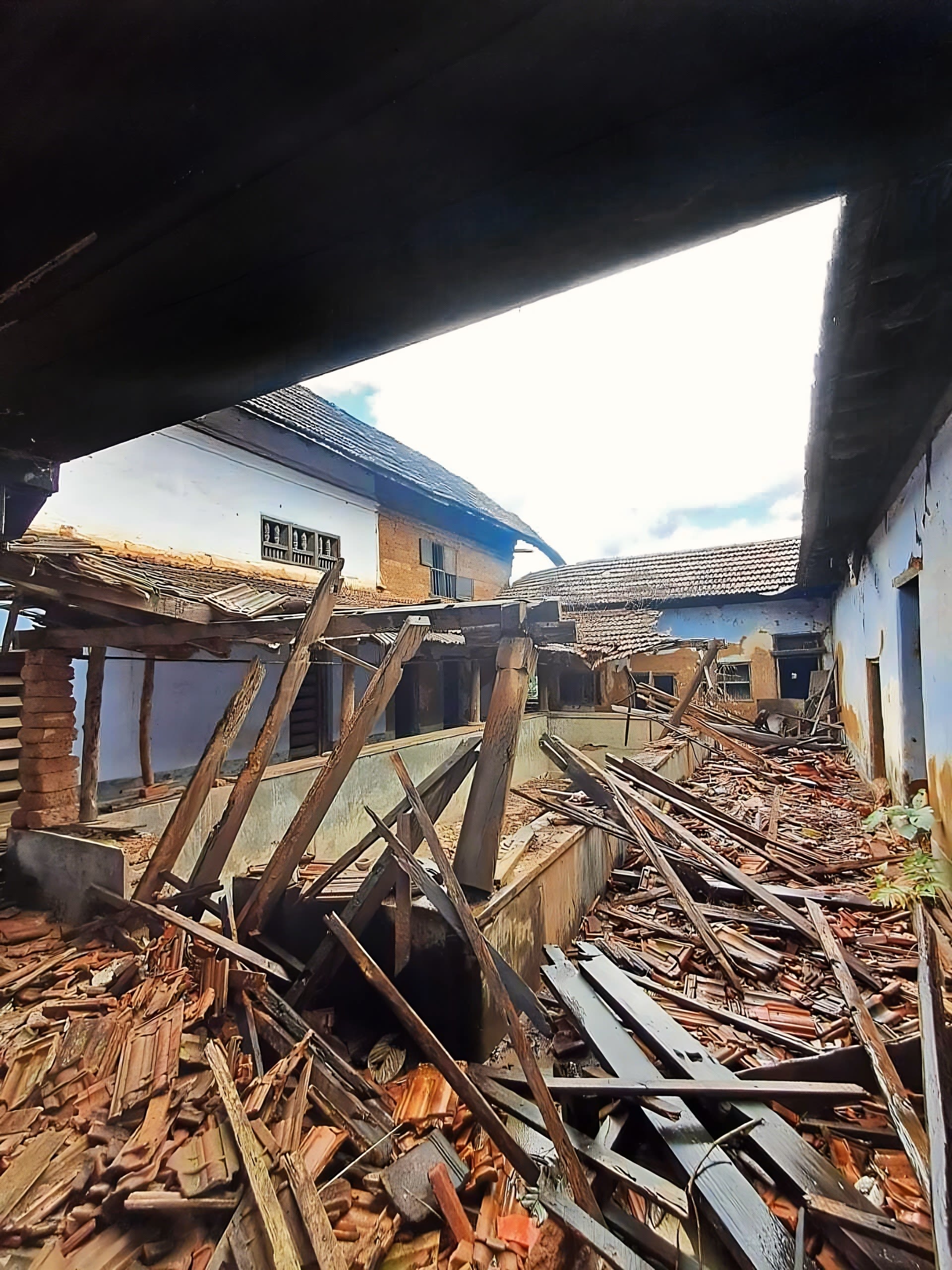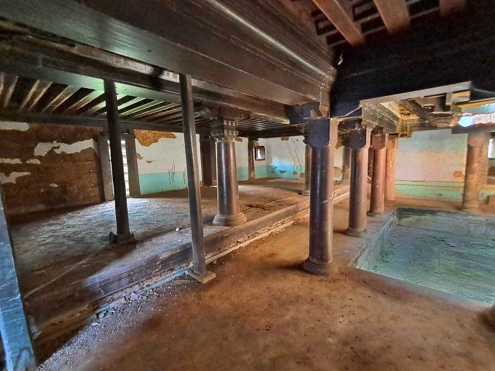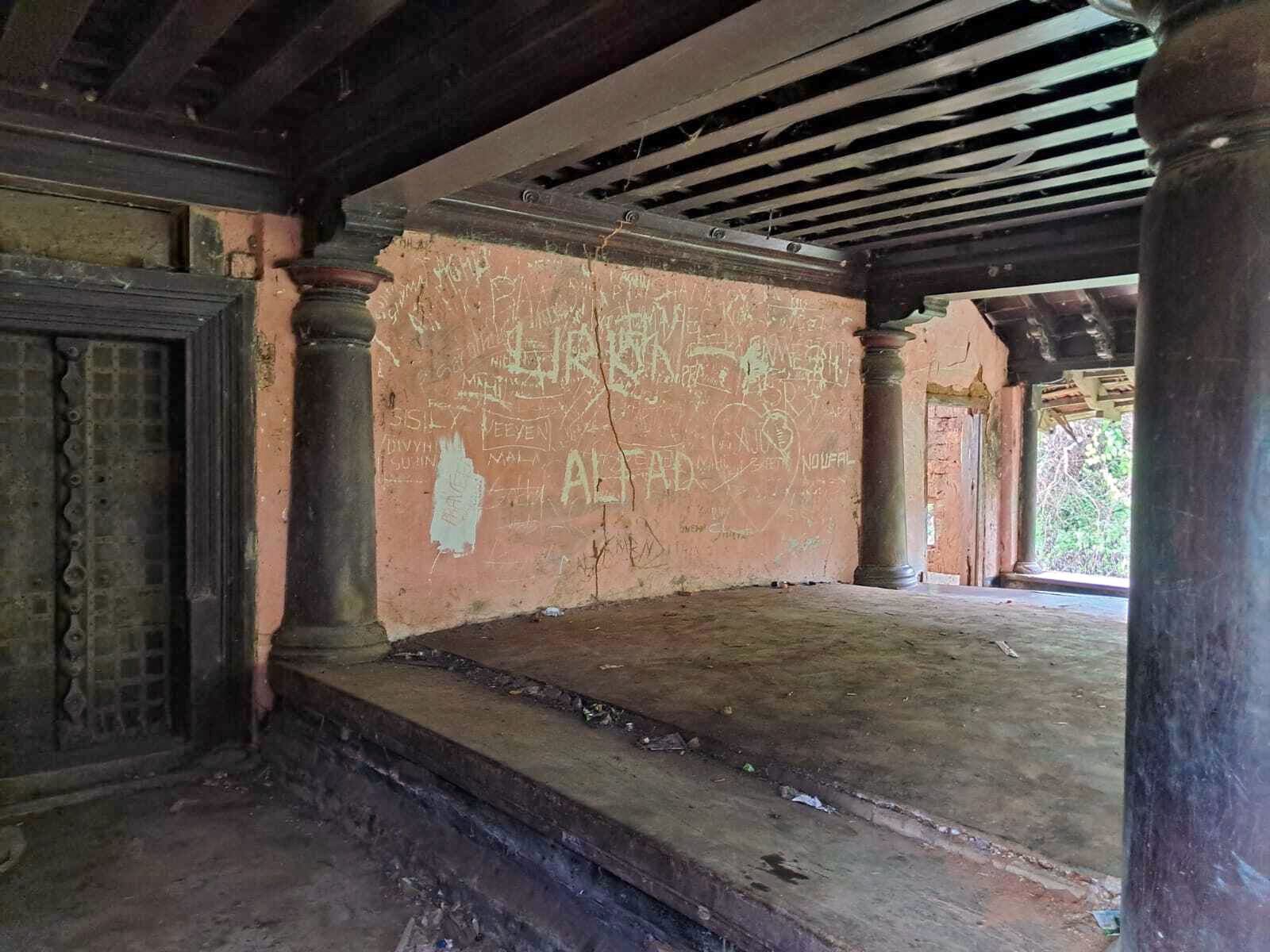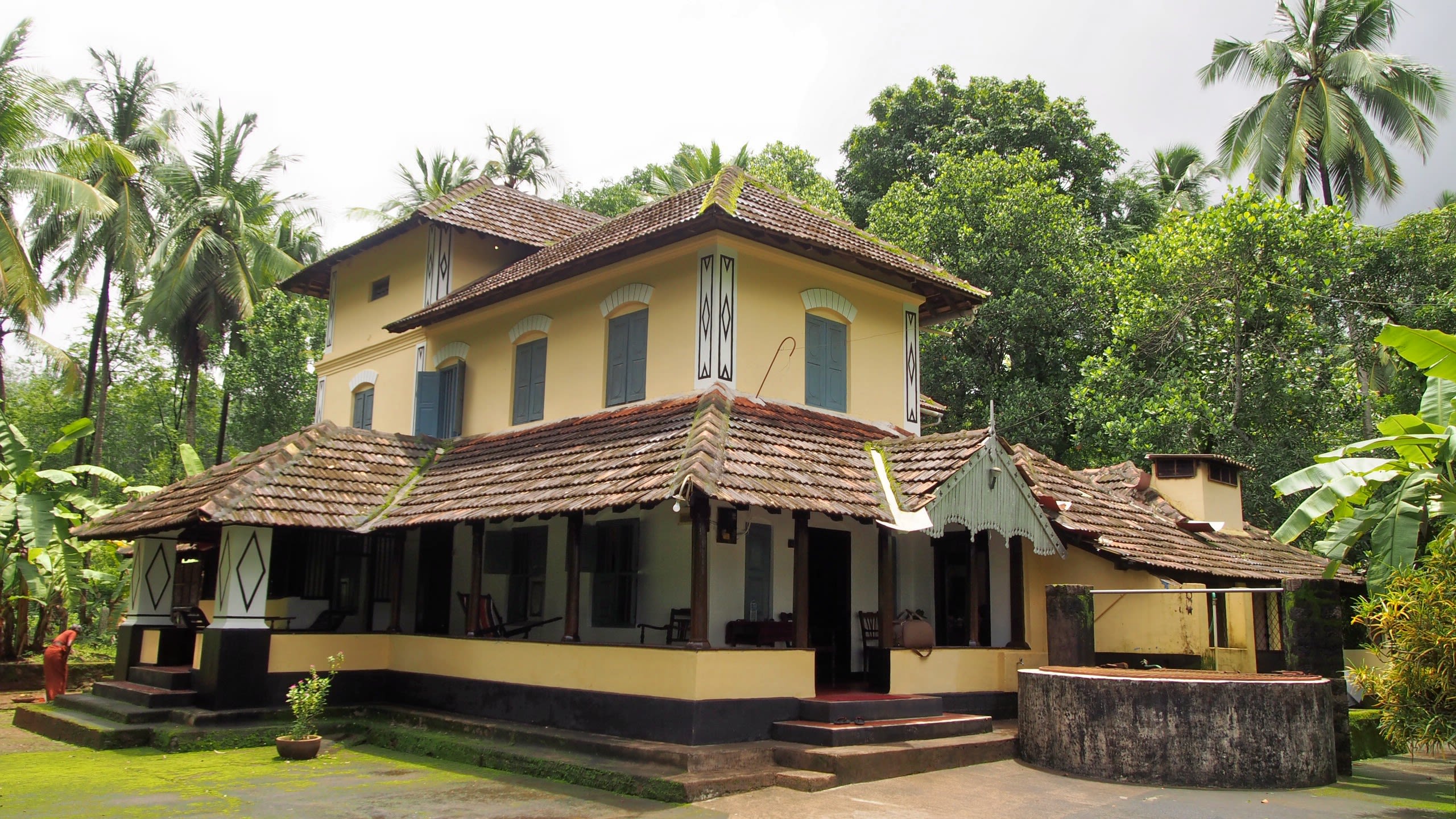 Example of a Kirriyam Nair tharavad. Like Namboothiri houses, tharavads were built in ode and adherence to Hindu cosmological beliefs. At the start of the 20th century, large tharavads housed up to 80 family members at a time. Today, after repeat partitions and urbanisation, these numbers have trickled down to 2 or 3 members. While many houses lay abandoned, some are cared for, lived in, or turned into resorts. Photograph by Devaki Vadakepat Menon. 2025.