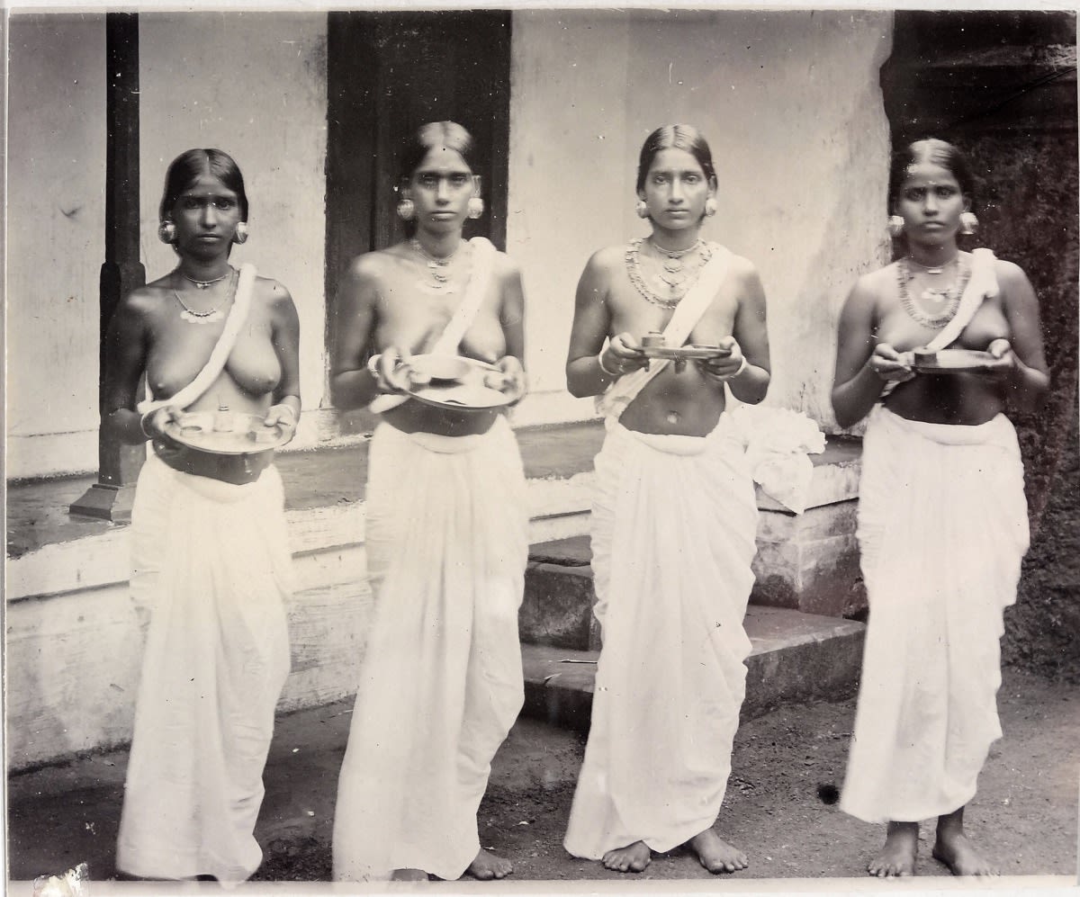 Towards the beginning of the 20th century, taboos around widowhood relaxed across most castes, and women were seldom ostracized for it. In this family photograph, married women are flanked by two widows who declare their status by abstaining from adornments such as the pottu dot on the forehead, the thali chain, thoda ear plugs, and finger or toe rings. However, they continue to wear the kaap bangle and thala anklet as part of their Nair identity.