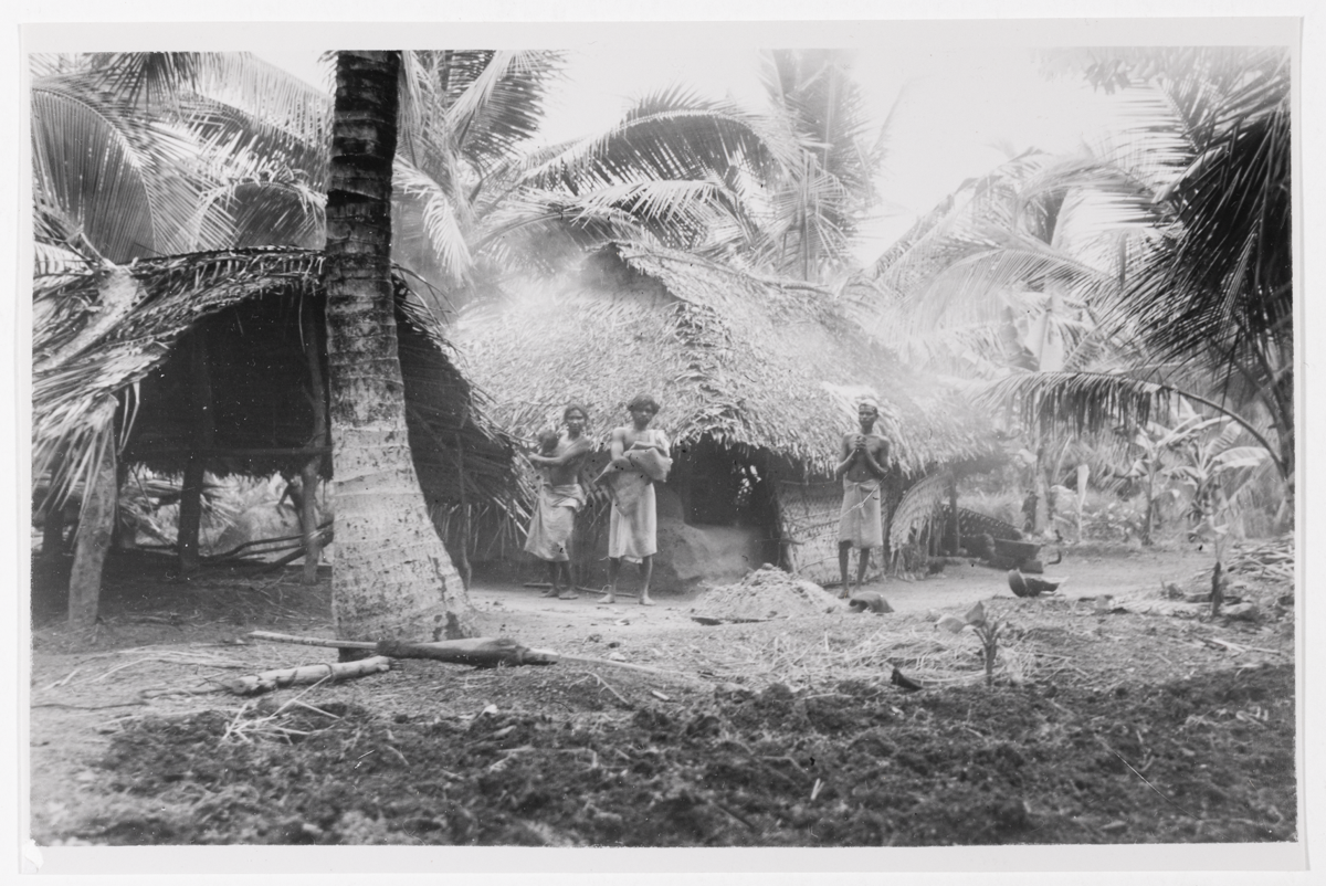 A Pulaya family near their mud and thatched roof hut. Emancipated slaves and then agricultural labourers by occupation, the Pulayas worked from plot to plot for the higher-caste communities and lived in portable shelters in close proximity to paddy fields. Photograph by L. K. Ananthakrishna Iyer. c. 1901-1908. MAA P.60783.HUT.