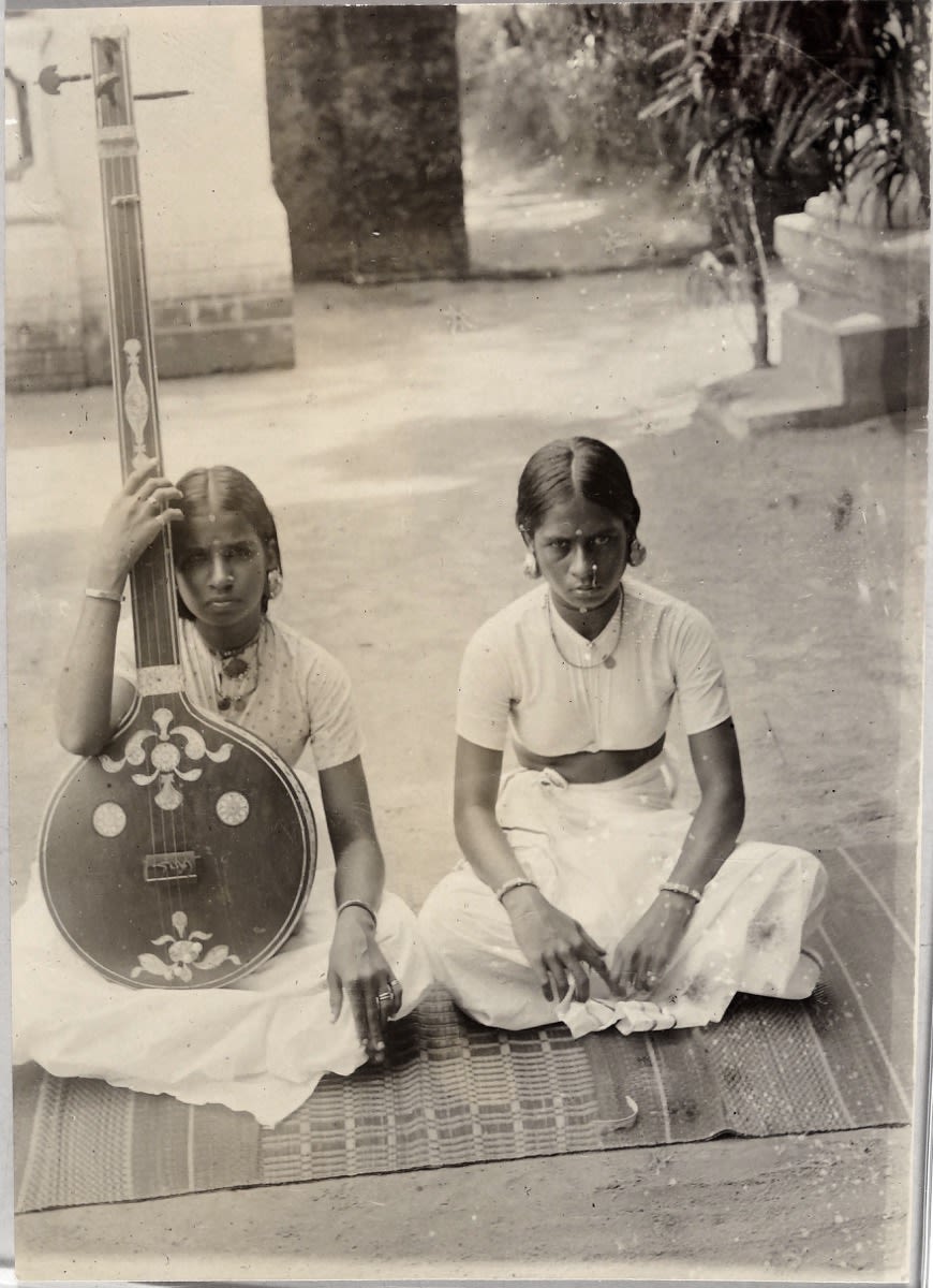 Teenaged or young adult Nair women seated on a mat. One of the women poses with a tanpura—a lute-like 4-string instrument. Nair women occupied a prominent position in Malayali society as a result of their education in the arts, sciences, languages, and literature. It was expected of many Nair girls to become prodigious in music, visual arts, and writing. Photograph by L. K. Ananthakrishna Iyer. c. 1901-1908. MAA P.36591.
