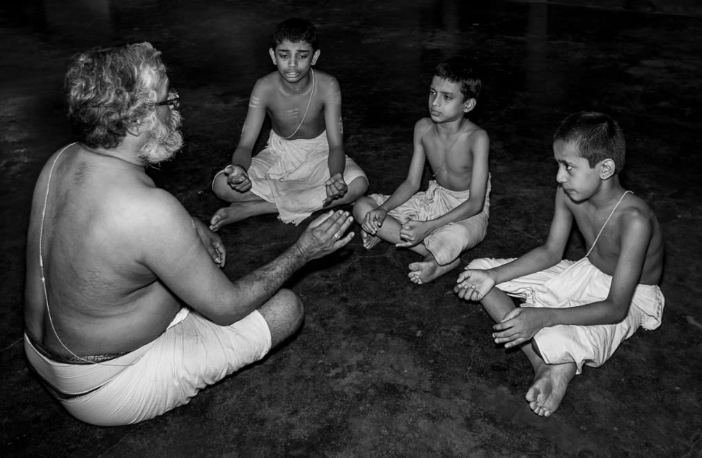 A guru and pupils reciting chants at the Brahmaswam Madham Vēdic school in Thrissur. Photograph by Vijay Nanda. March 2015.