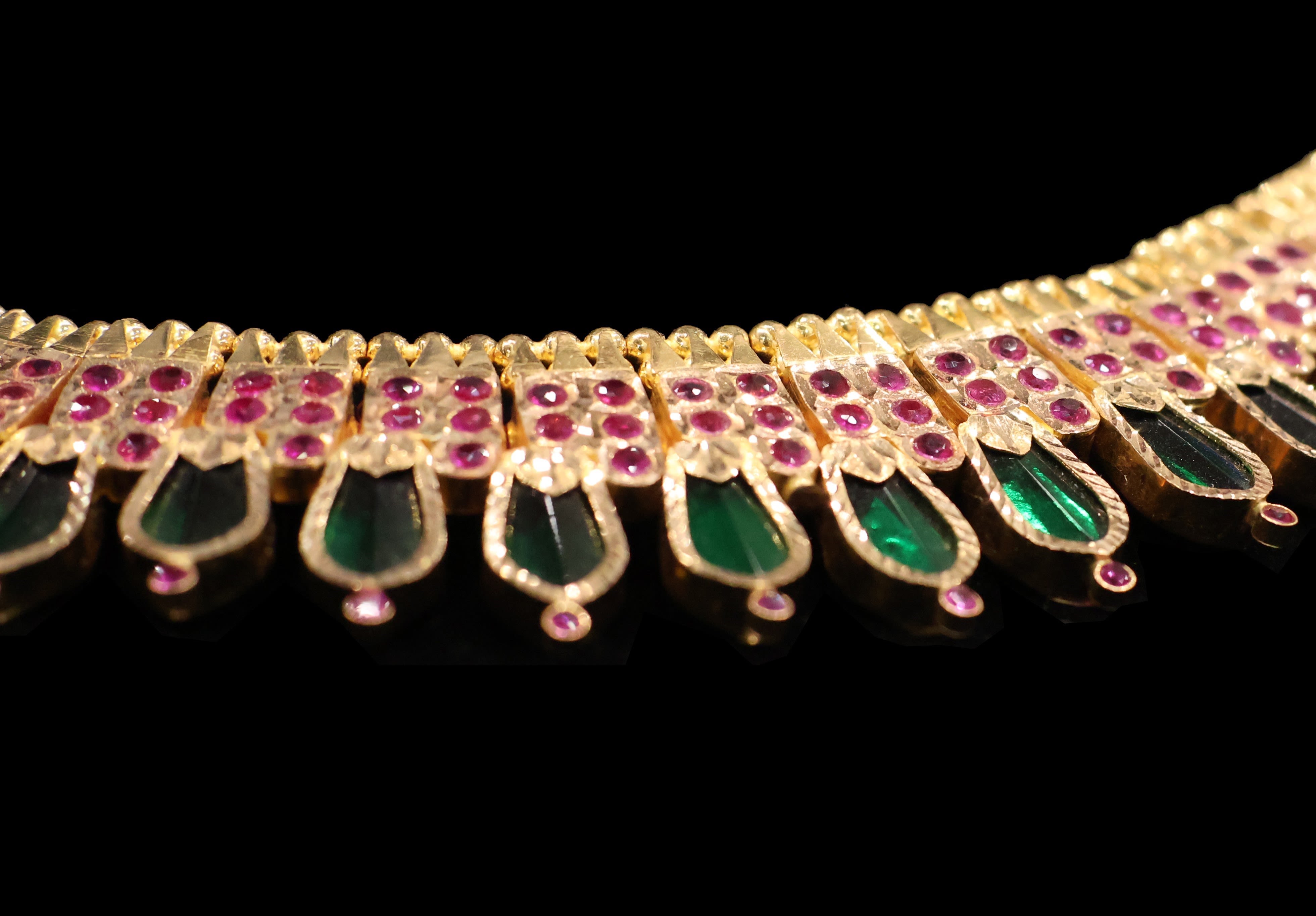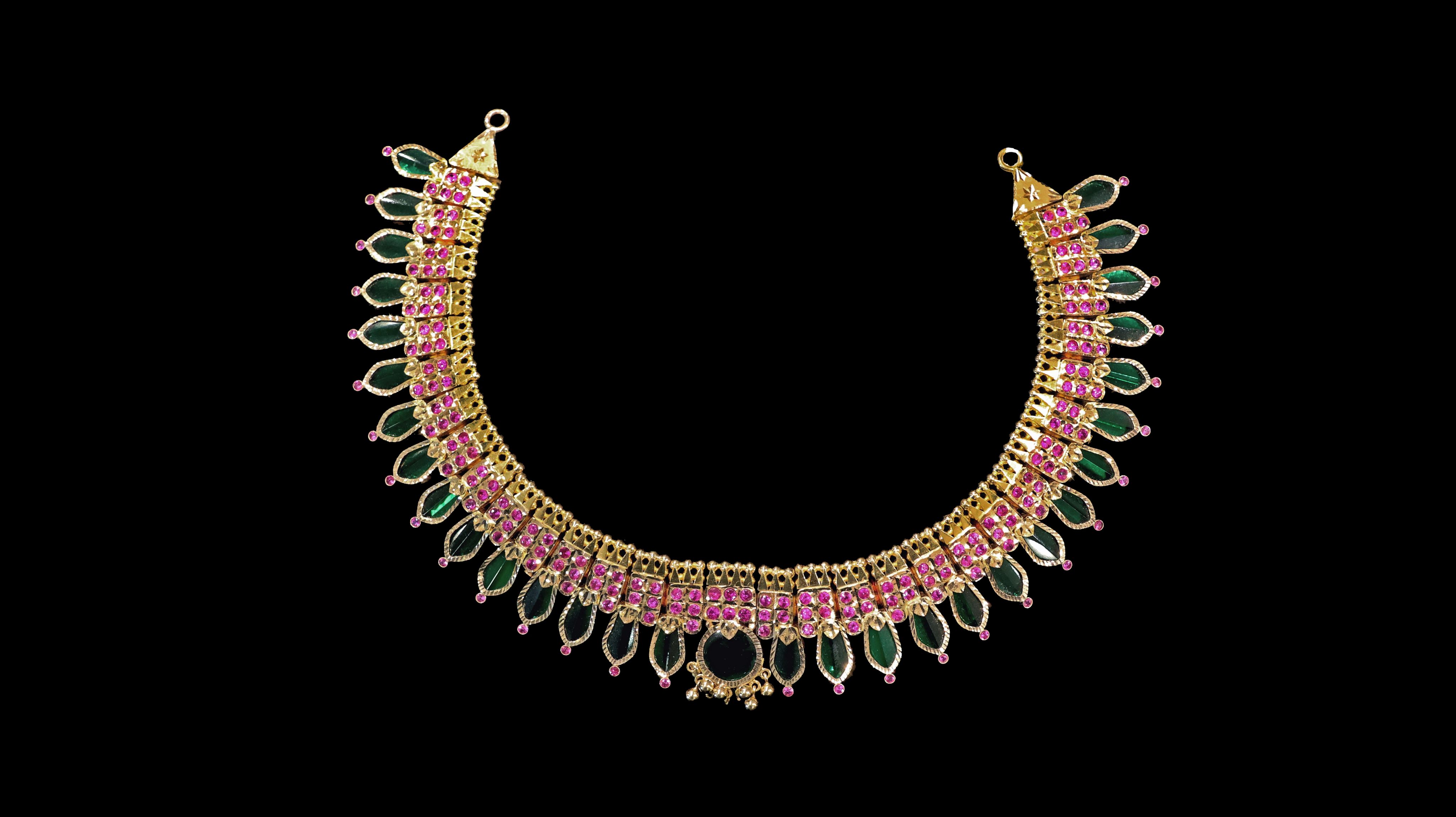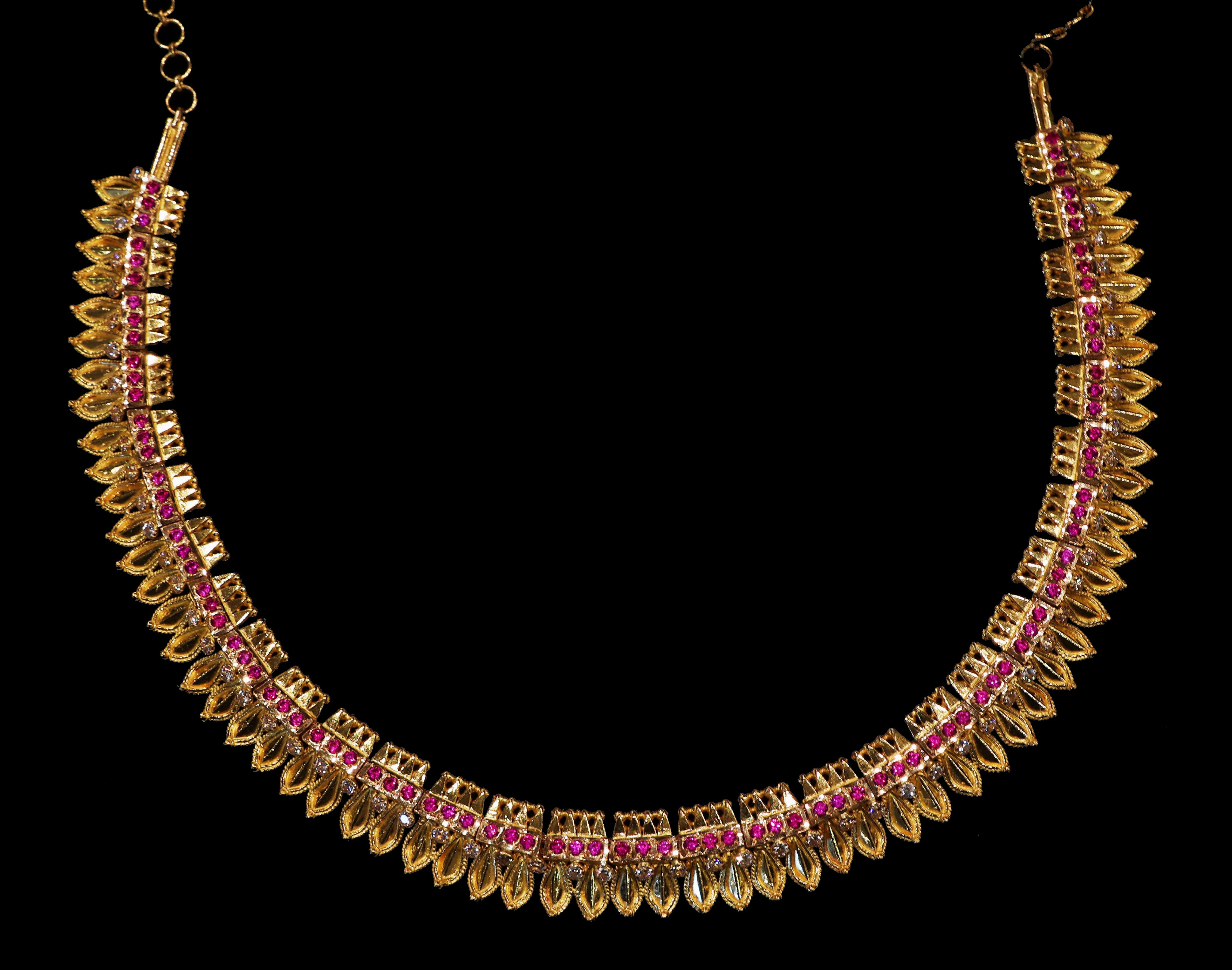 A gold kazhutilla fitted with rubies. Its design can represent leaves or snake hoods. Photograph by Devaki Vadakepat Menon, at Thottan Jewellers in Thrissur. 2025