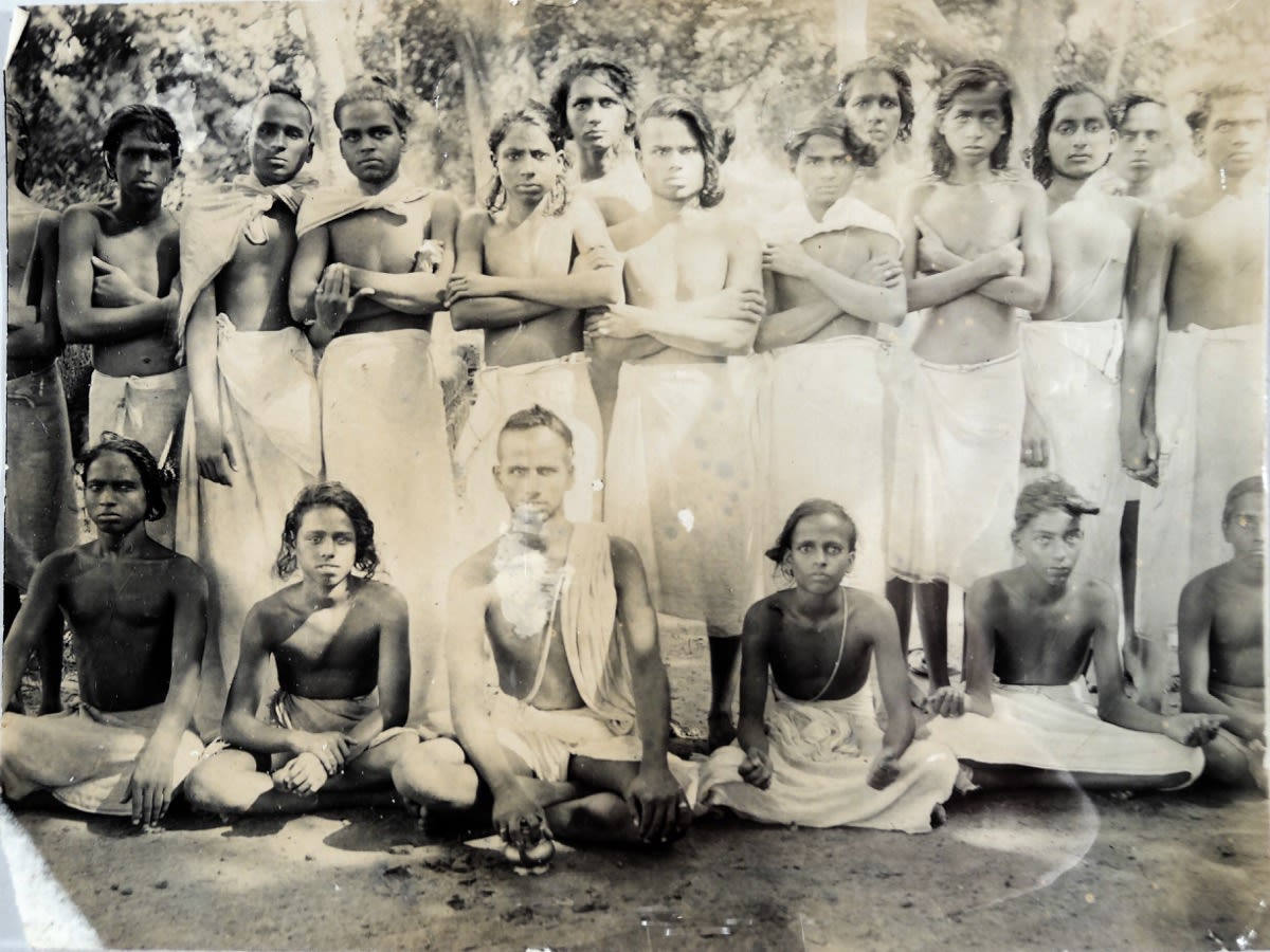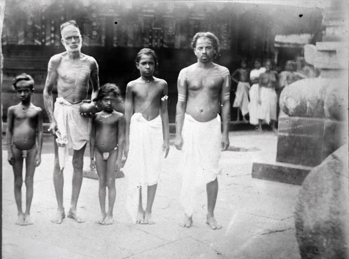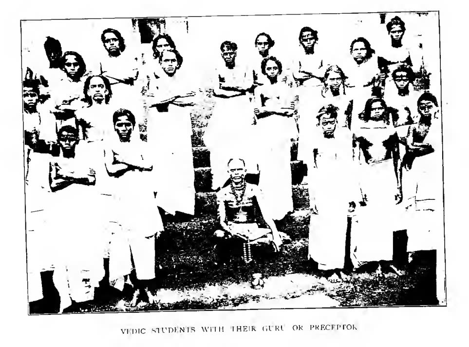 Vēdic students with their guru, likely taken at a Madham. The students have finished their Samavarthanam (transition to domestic life) as they are not wearing the strip of antelope leather. They no longer wear the loin cloth, and instead are clothed in the cotton randaam mundu towel, which is draped over their shoulders. The pavitram ring is now on the ring finger of their right hand, rather than around their necks as a locket. Photograph by L. K. Ananthakrishna Iyer. c. 1901-1908. MAA P.36561.ACH2