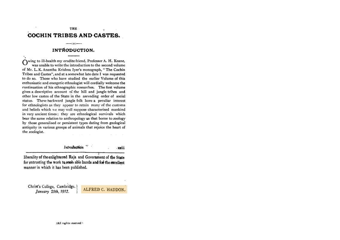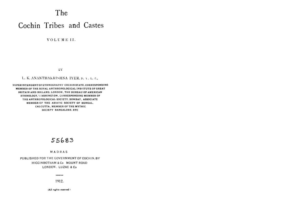 In 1912, Iyer published the second volume of Cochin Tribes and Castes. In this, he argued that the higher social-ranking groups and non-Hindu people of Cochin must also be of ethnographic interest to anthropologists.