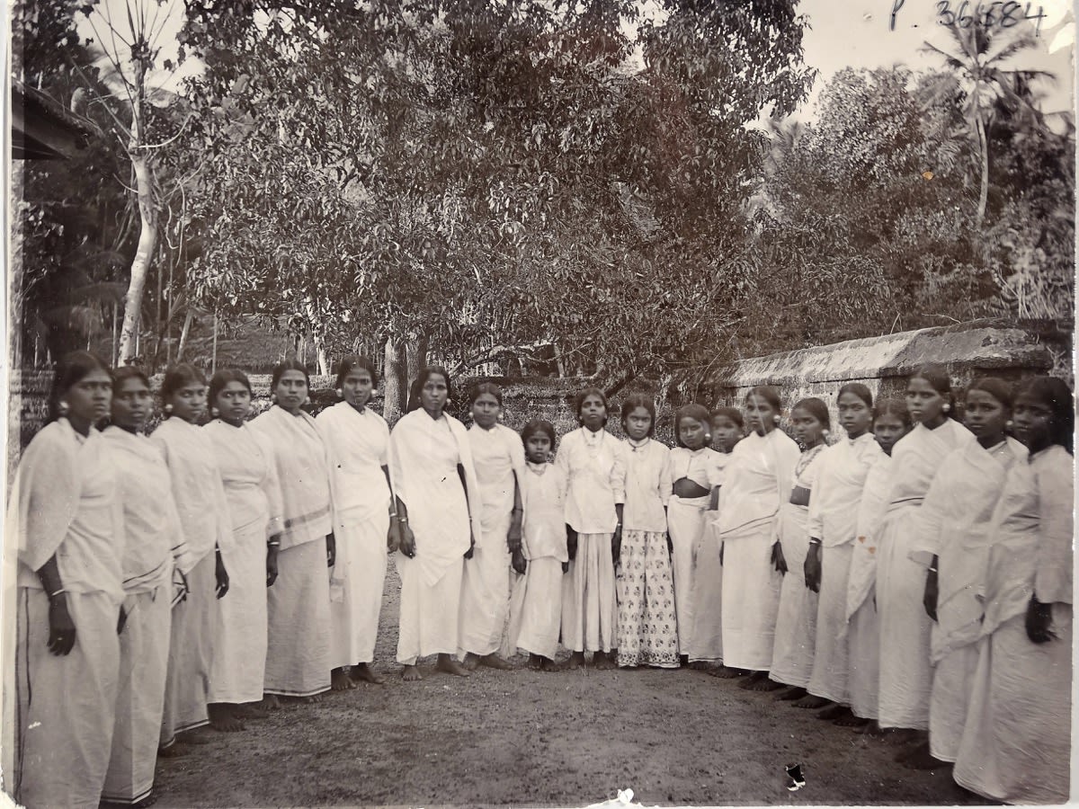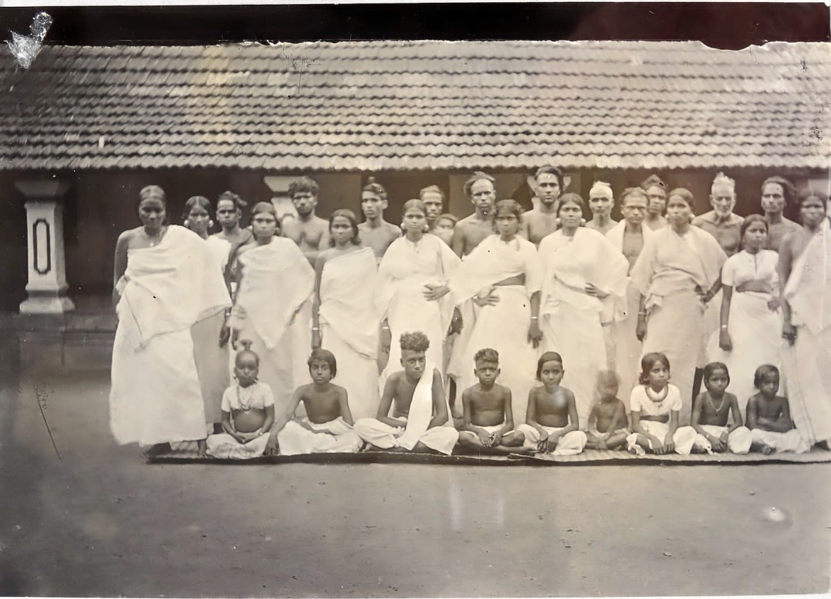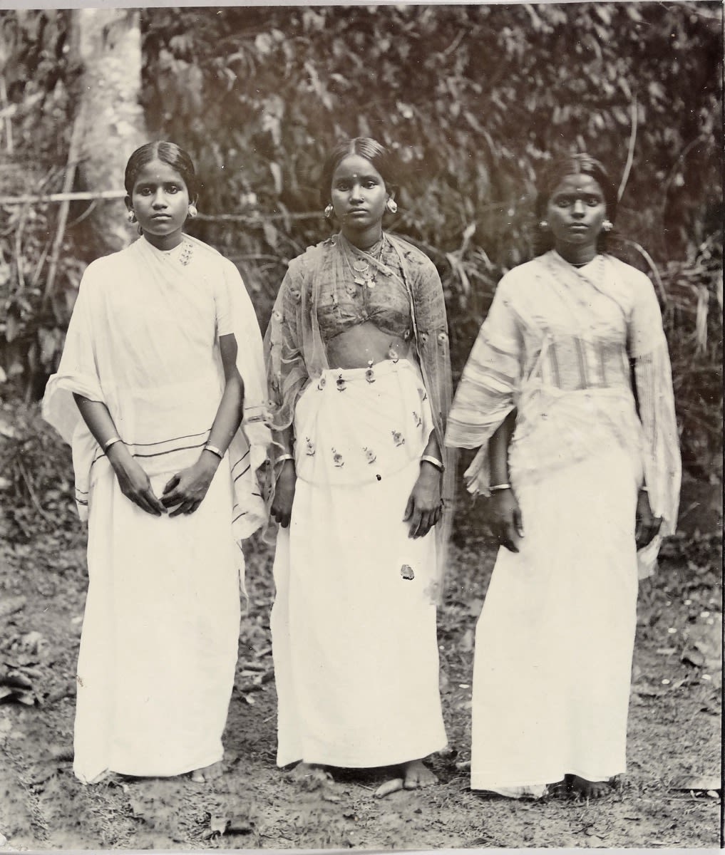 A group of Nair women and girls pose in the courtyard of a tharavad. The girls in the middle are dressed in imported shirts with patterned skirts, which at the time indicated diaspora in the family and assumed a display of affluence. Nair families in the 20th century had begun establishing themselves in Burma and Penang. Two girls are wearing a cropped blouse, or the rowka, which in many families indicated recent brides. The surrounding women are dressed in the traditional mundum neriyatum. Photograph by L. K. Ananthakrishna Iyer. c. 1901-1908. MAA P.36584.