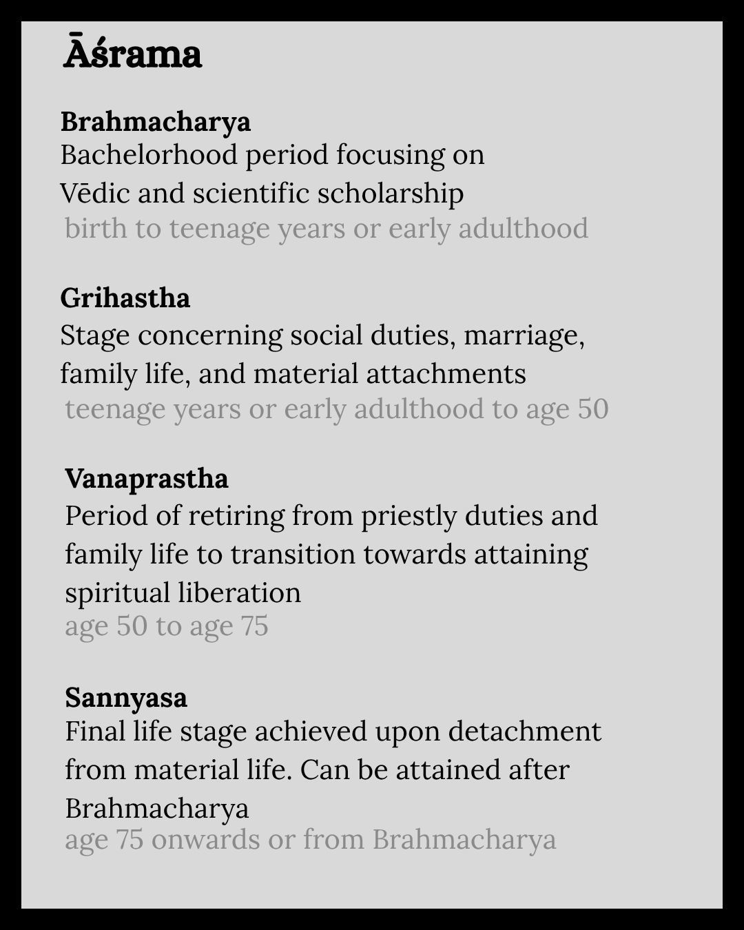 Namboothiris abided by the Āśrama system of life stages, each with their set of holy laws. Based off these laws were guidelines for daily activities, architecture, dressing styles, and adornments.