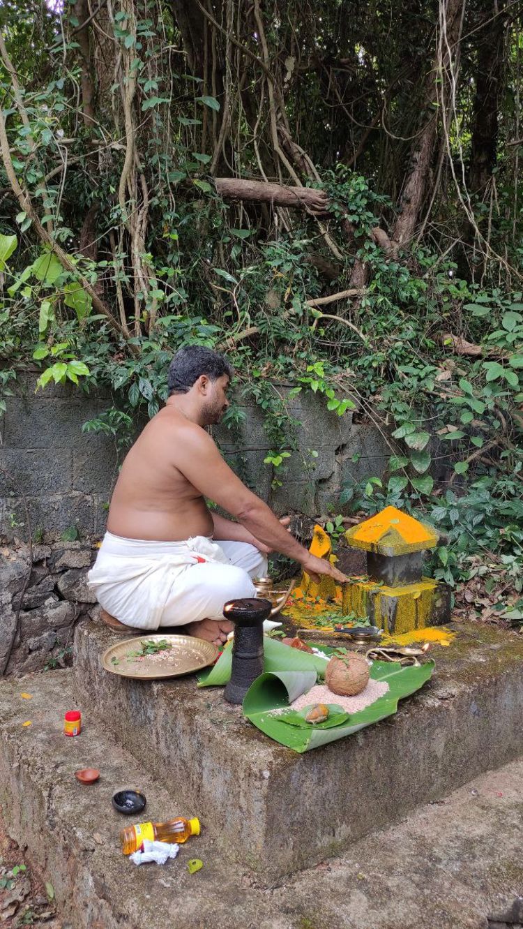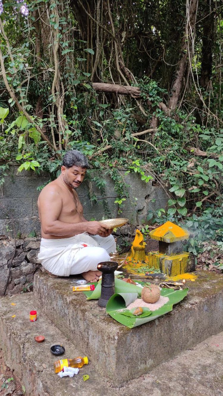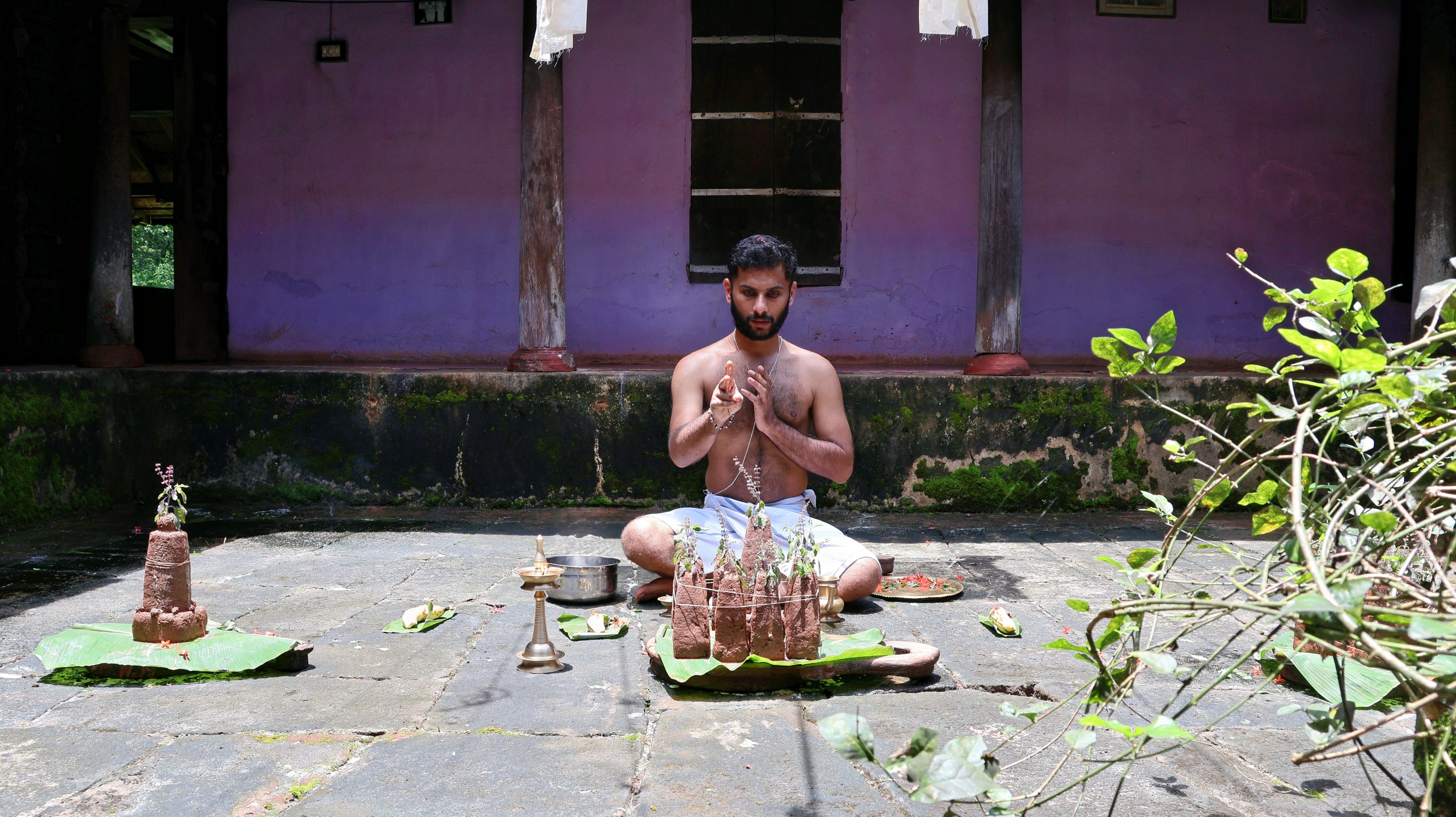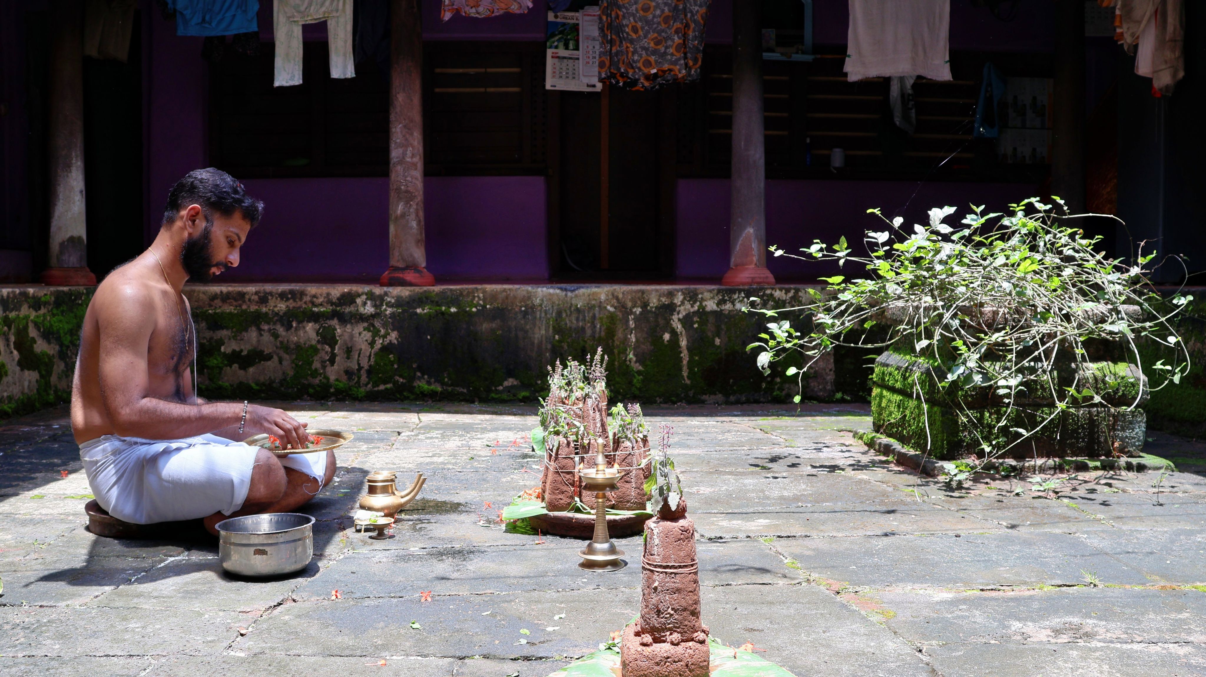 A Namboothiri man sat in his illam's nadumuttam performs a votive ritual during the Onam festival. Photographs taken by Devaki Vadakepat Menon. September 2025.