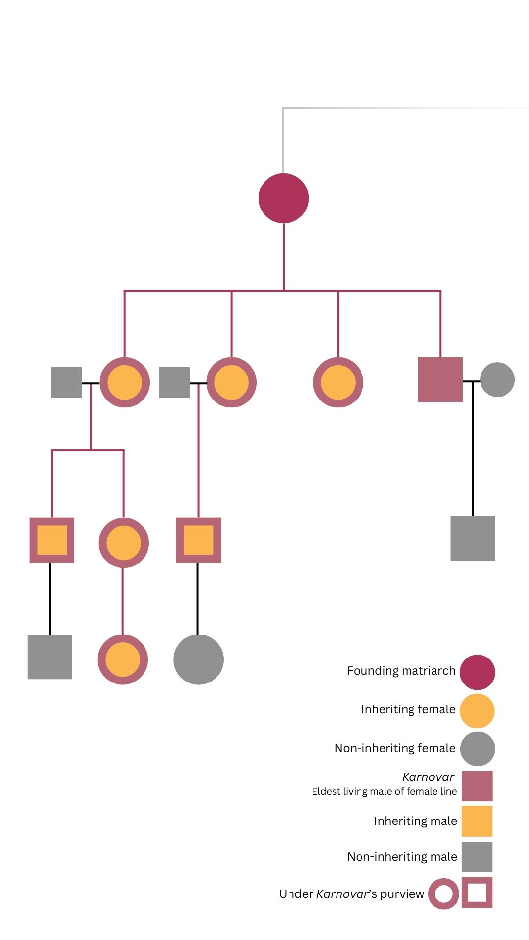 Note: Institutionalised primogeniture among the Namboothiris prevented younger sons from marrying Namboothiri women. These members often married Kirriyam or Illathu Nair women instead, thus ending a lineage of Namboothiris as their progeny would (according to matrilineal inheritance followed by their wives) become Nairs.