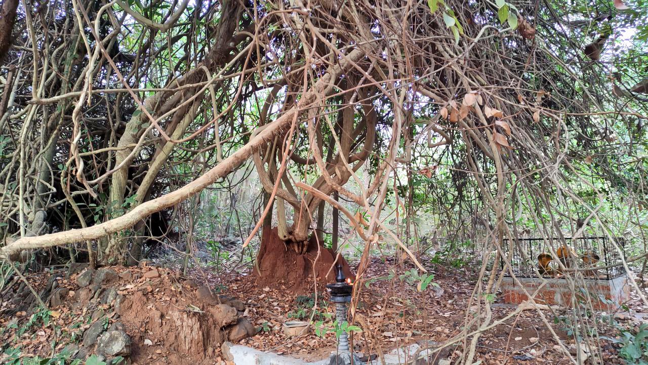 A Nair family's saarpa kaavu (serpent shrine) is a thriving ecosystem complete with peepal, banyan, and a variety of medicinal plants. In the centre is a termite mound inhabited by various species of snakes, and to the right are stone-carved figures of Nāga deities. For Nairs, the shrine is an important aspect of nature worship. Thus, the upkeep of the grove's ecology assumes the most significant display of devotion.